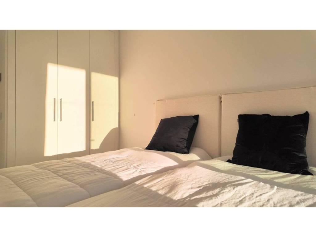 The apartment comprises three well-proportioned bedrooms, all with built-in wardrobes in a clean, Scandinavian-inspired style, and two contemporary bathrooms finished with quality materials.