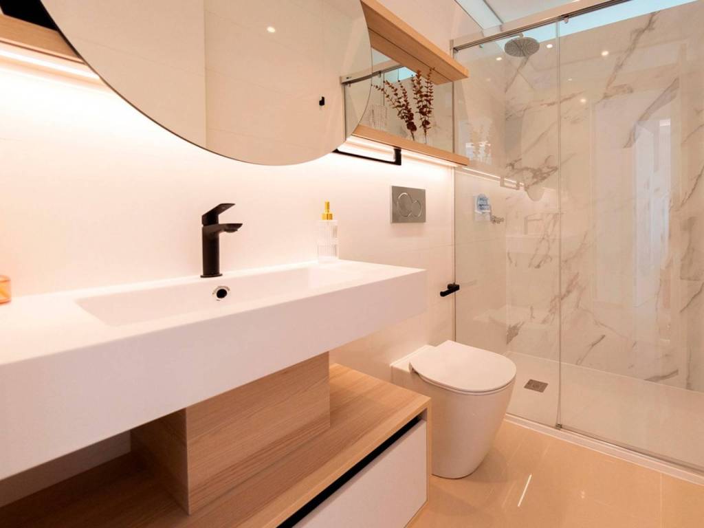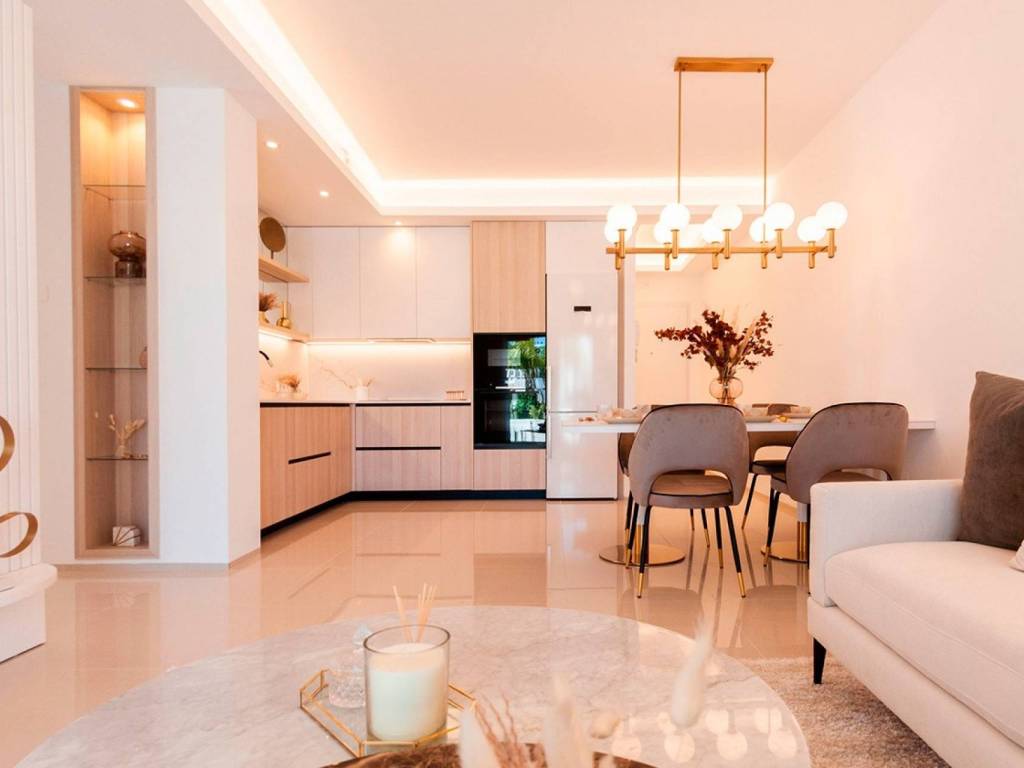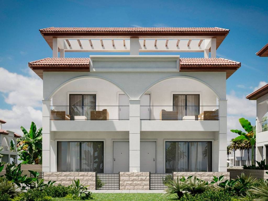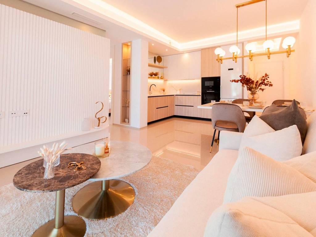 Each townhouse has 3 bedrooms and 2-3 bathrooms, including a master bedroom with en-suite. The open-plan design integrates the living room with the kitchen, creating a spacious area ideal for everyday living and entertaining. From the living room, there is direct access to a private terrace that connects to a personal garden, while the rooftop, accessible via internal stairs, provides additional space perfect for enjoying the Mediterranean climate.
