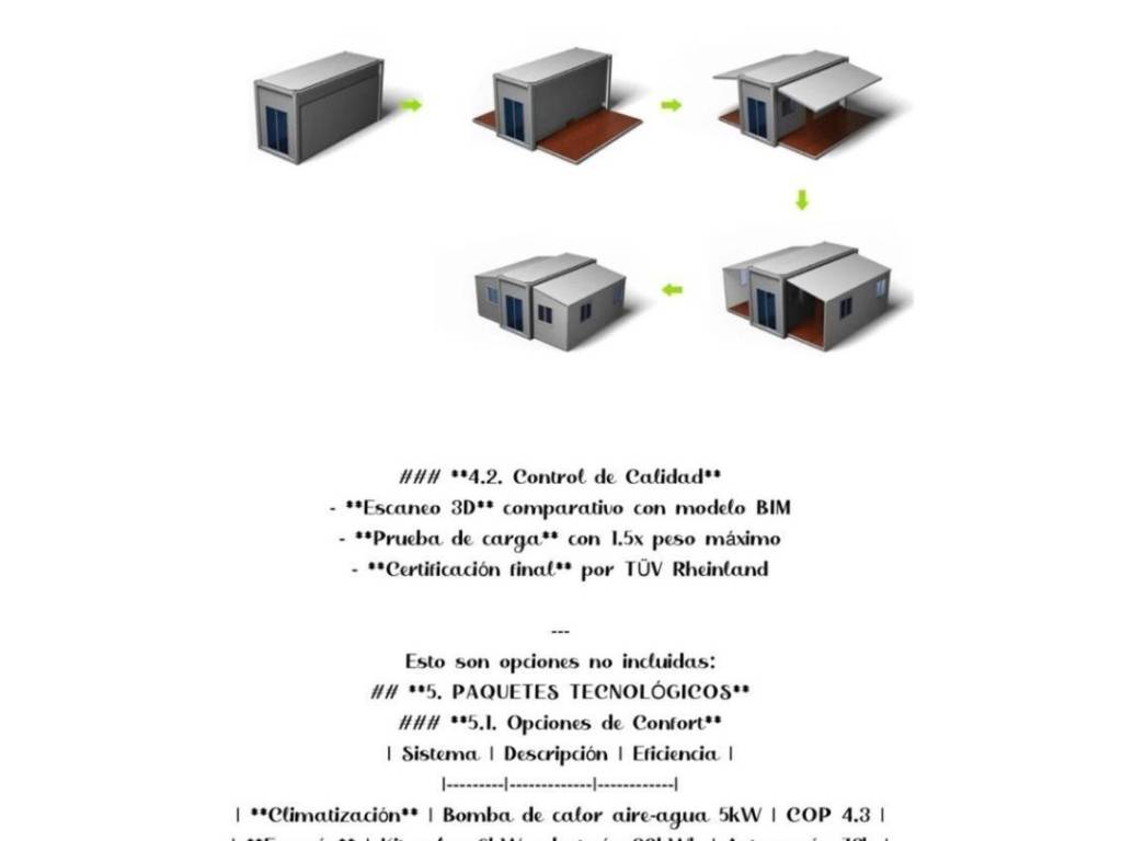 Il prezzo include il trasporto e il montaggio sul terreno, senza costi nascosti. Viene inoltre fornita con l'impianto idraulico completamente installato, consentendo di avere una base solida e funzionale fin dall'inizio. Sebbene non includa mobili o decorazioni, hai la libertà di adattarla completamente al tuo stile, poiché la disposizione interna e le finiture esterne possono essere configurate in base alle tue preferenze.