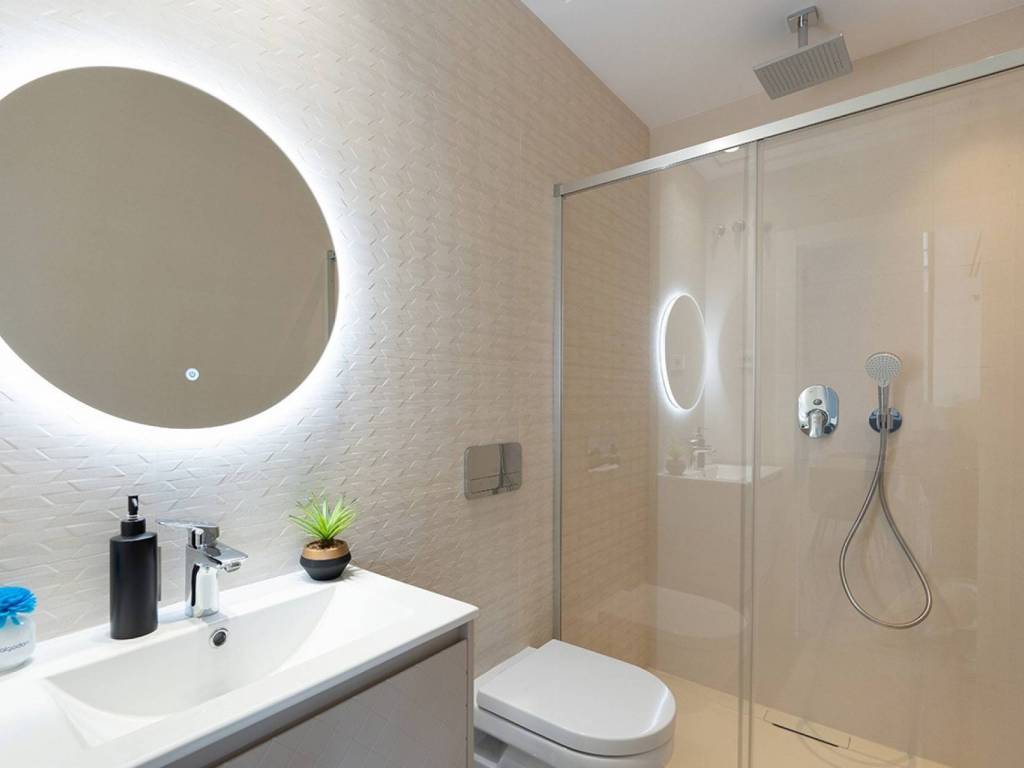 Plumbing and sanitation: High-quality suspended sanitary ware, single-lever faucets, and hot water production via an aerothermal system.