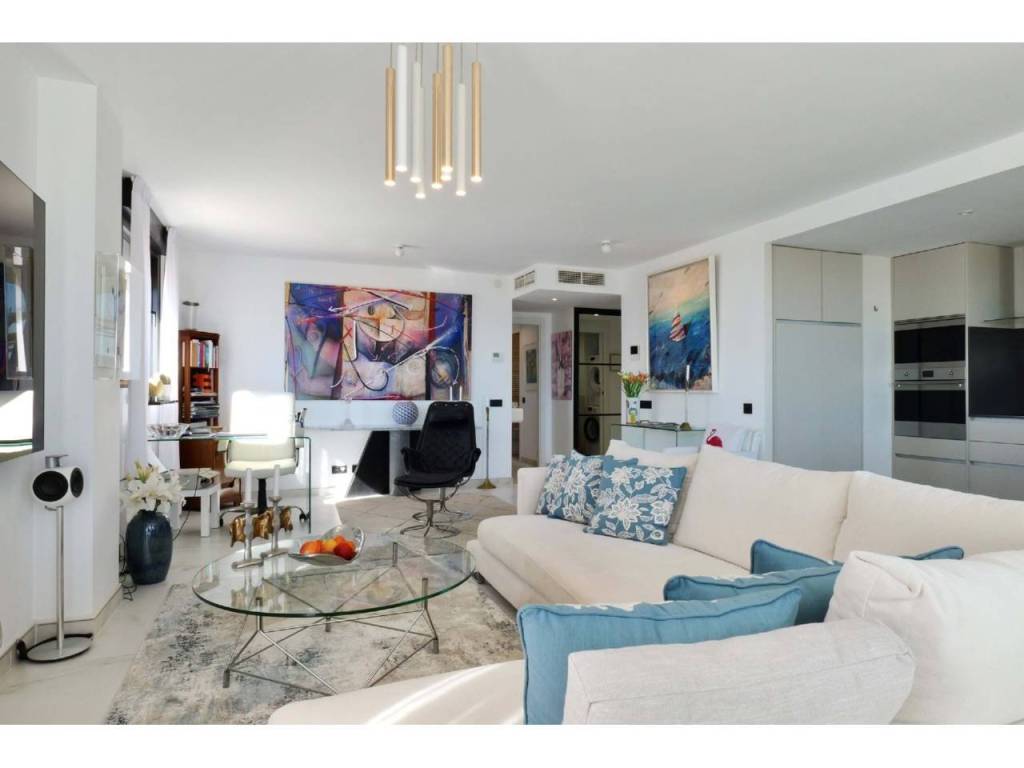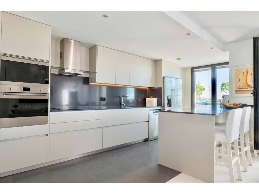 La moderna cocina se integra a la perfección con el salón y está equipada con electrodomésticos de alta gama y elegantes acabados.