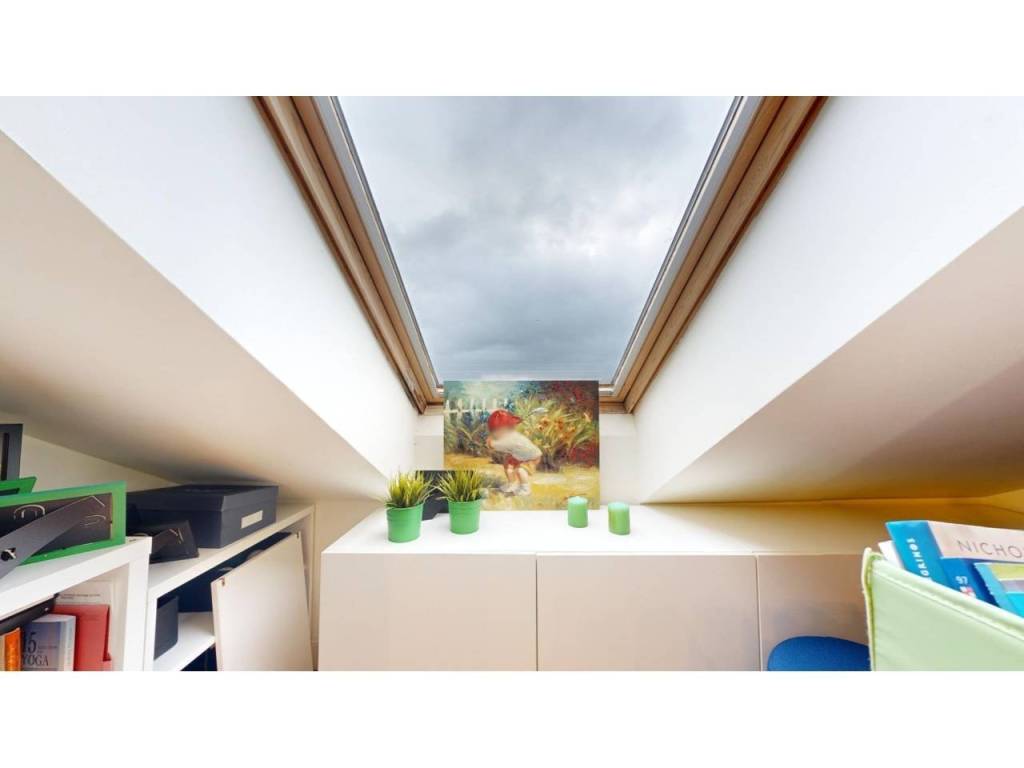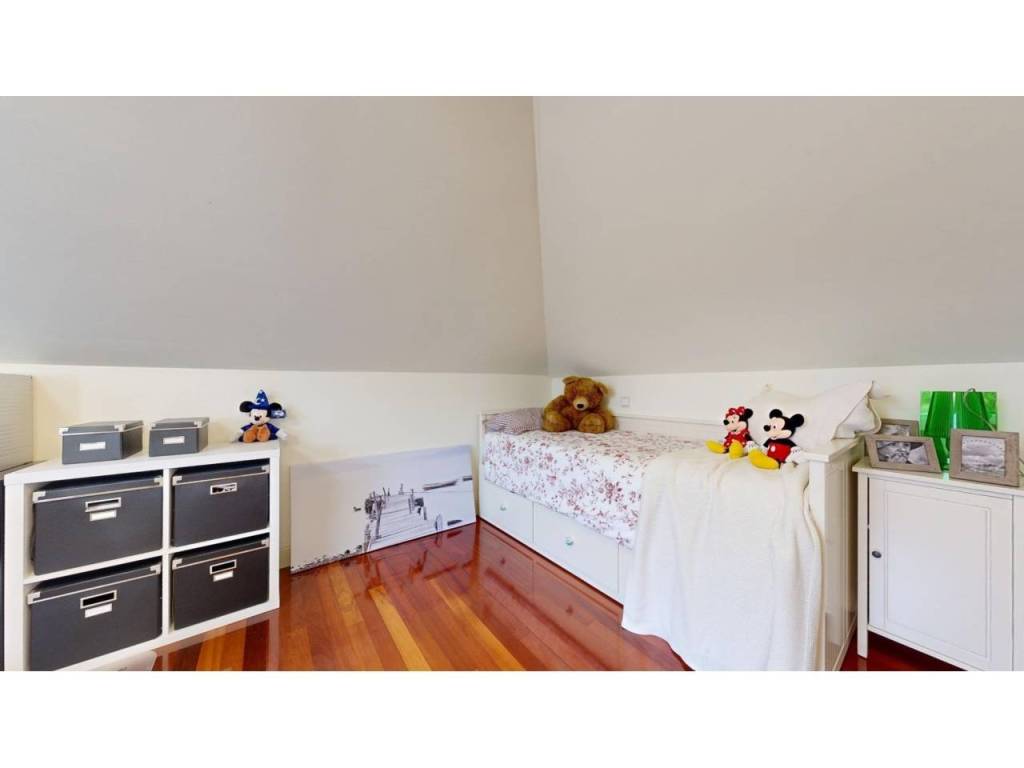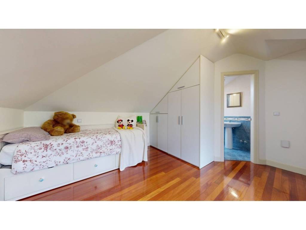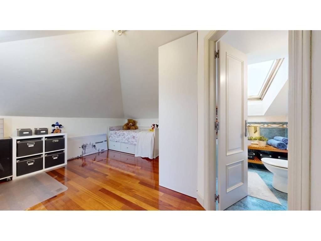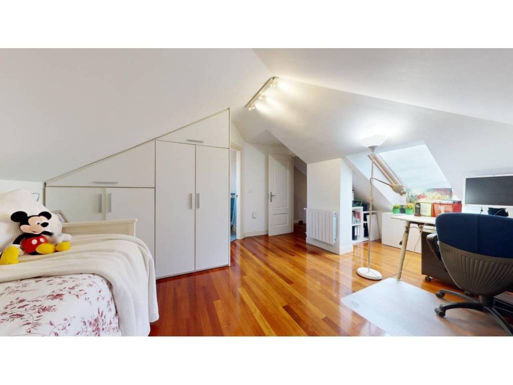 La buhardilla ofrece un espacio extra para lo que necesites. Actualmente funciona como dormitorio y despacho, con armario empotrado, velux que aporta mucha luminosidad y un encanto especial, y un baño completo con ducha.