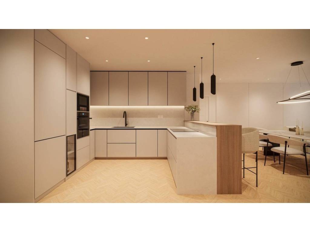 • Cocina de grandes dimensiones, concebida como espacio central del hogar, con electrodomésticos de alta gama, barra integrada y vinoteca