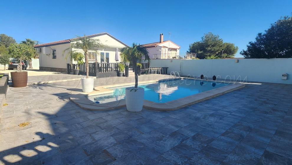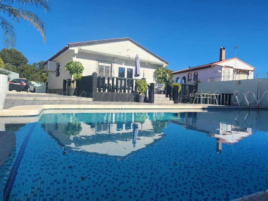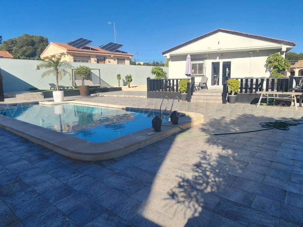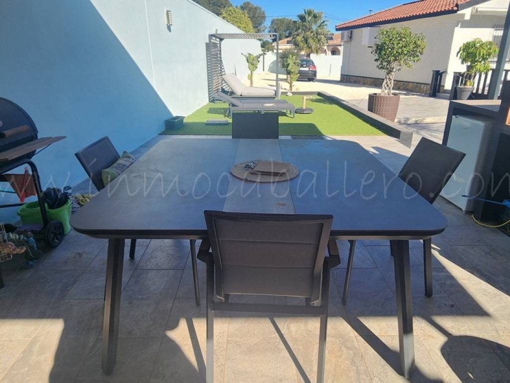 En la parcela se encuentra un jardín de bajo mantenimiento, aparcamiento para varios vehículos, una piscina con amplia terraza y una zona de barbacoa.