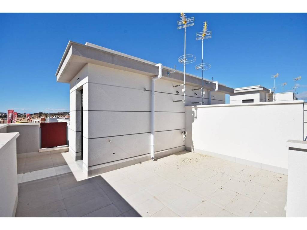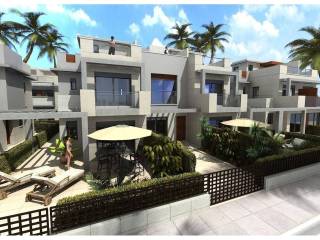 Each villa offers a built area of 101 sqm on a corner plot of 126 sqm, distributed over two floors plus a solarium. On the ground floor you will find a bright living room, an independent kitchen with access to the rear of the plot, one double bedroom and one full bathroom. The first floor features two bedrooms, one with access to two terraces with open views, and the other with an ensuite bathroom, plus an additional family bathroom. The top floor is dedicated to a private solarium of 31 sqm with stunning sea views, perfect for sunbathing, outdoor dining or relaxing with friends.