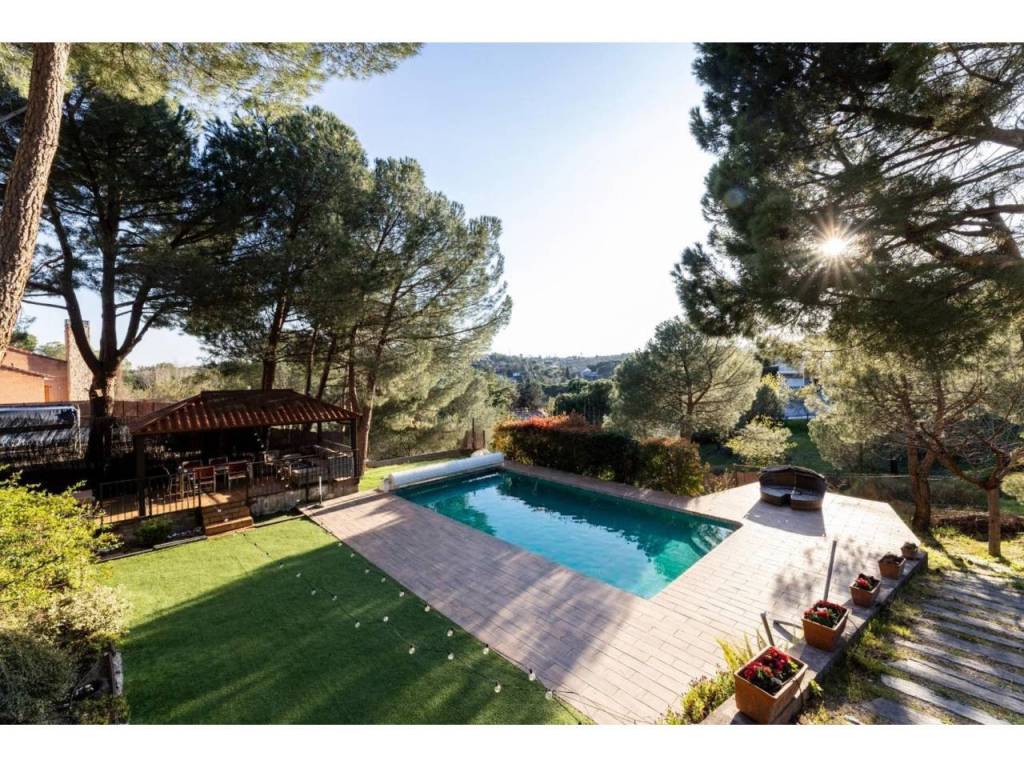 El chalet dispone de una amplia zona ajardinada, ideal para disfrutar al aire libre. La parcela alberga una piscina de sal, cenador y diferentes espacios pensados para el descanso y el entretenimiento, todo ello acompañado de estupendas vistas que refuerzan la sensación de tranquilidad y exclusividad.