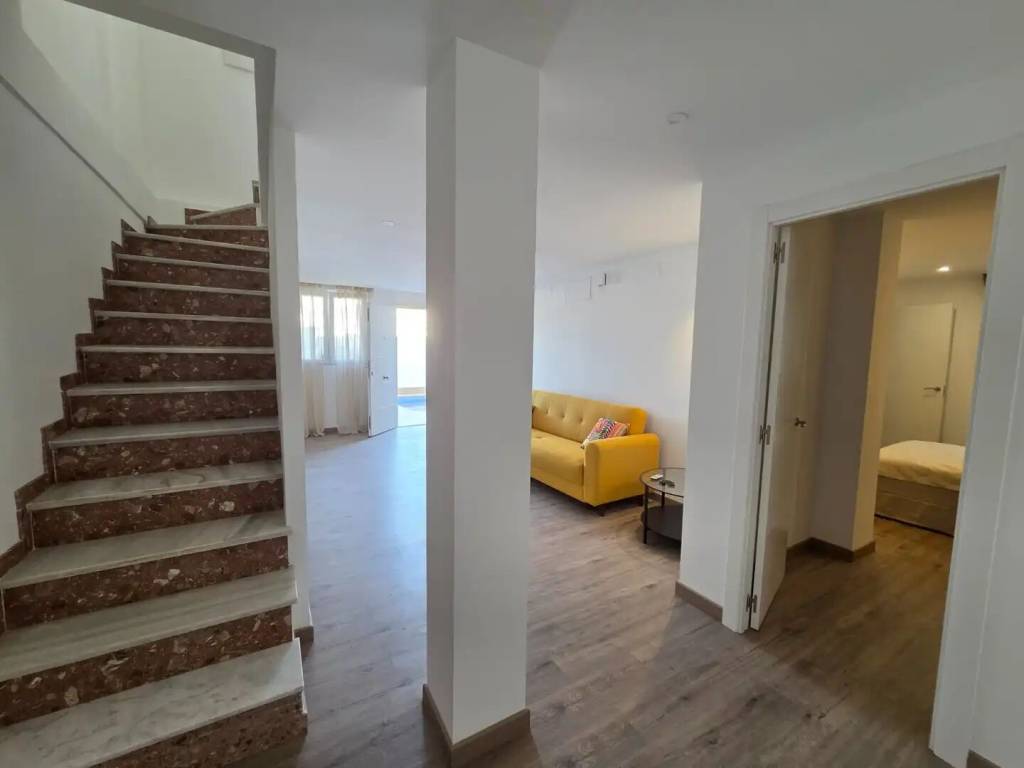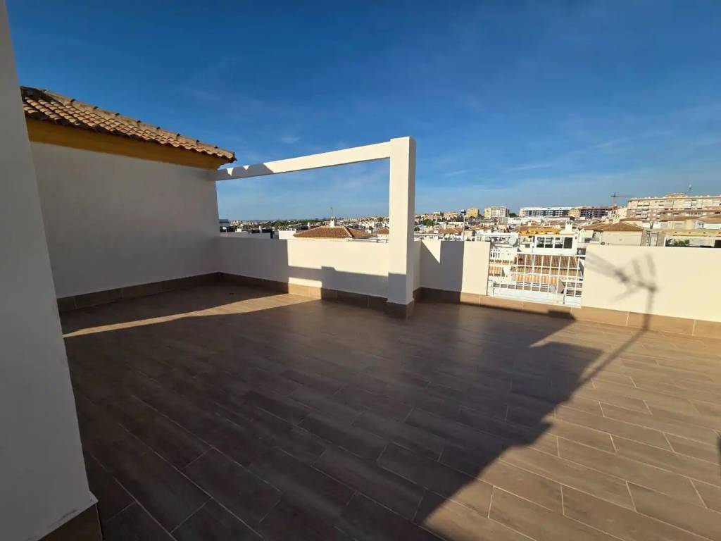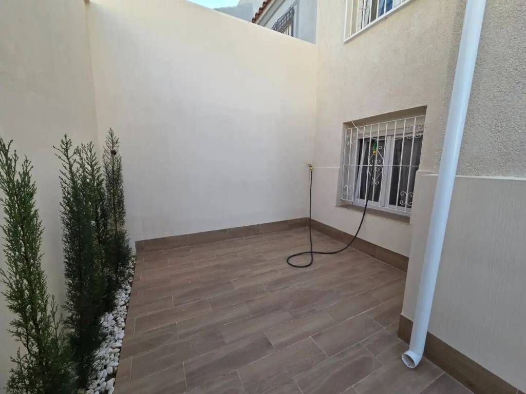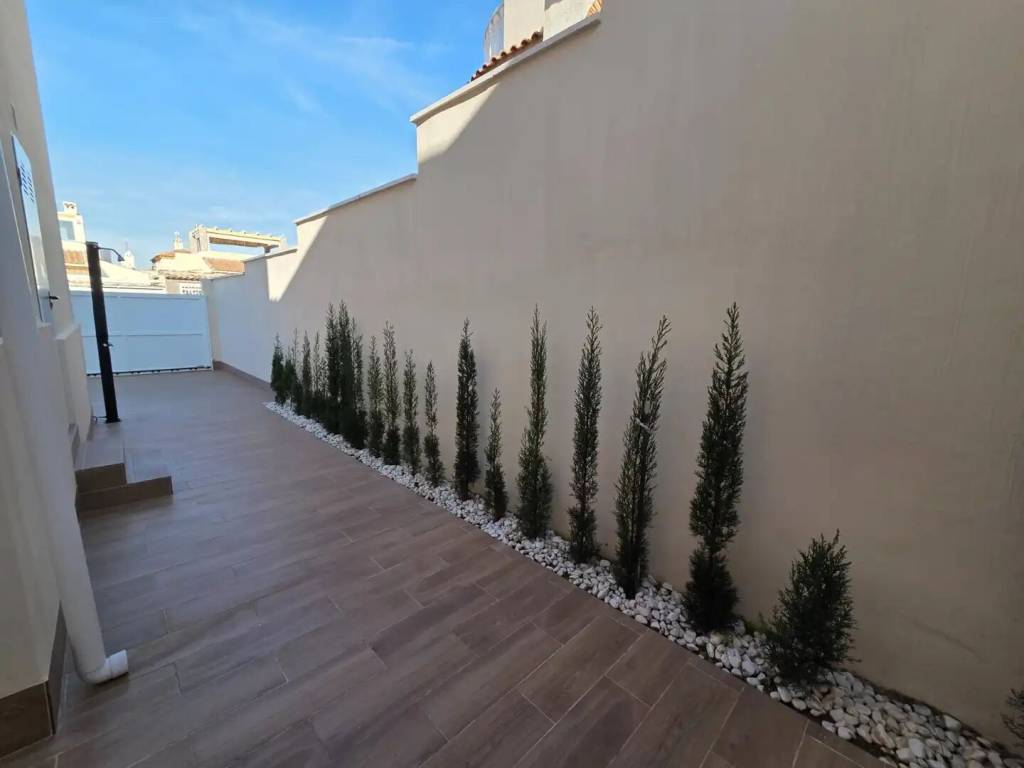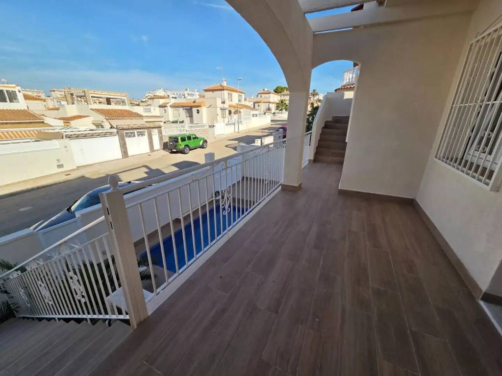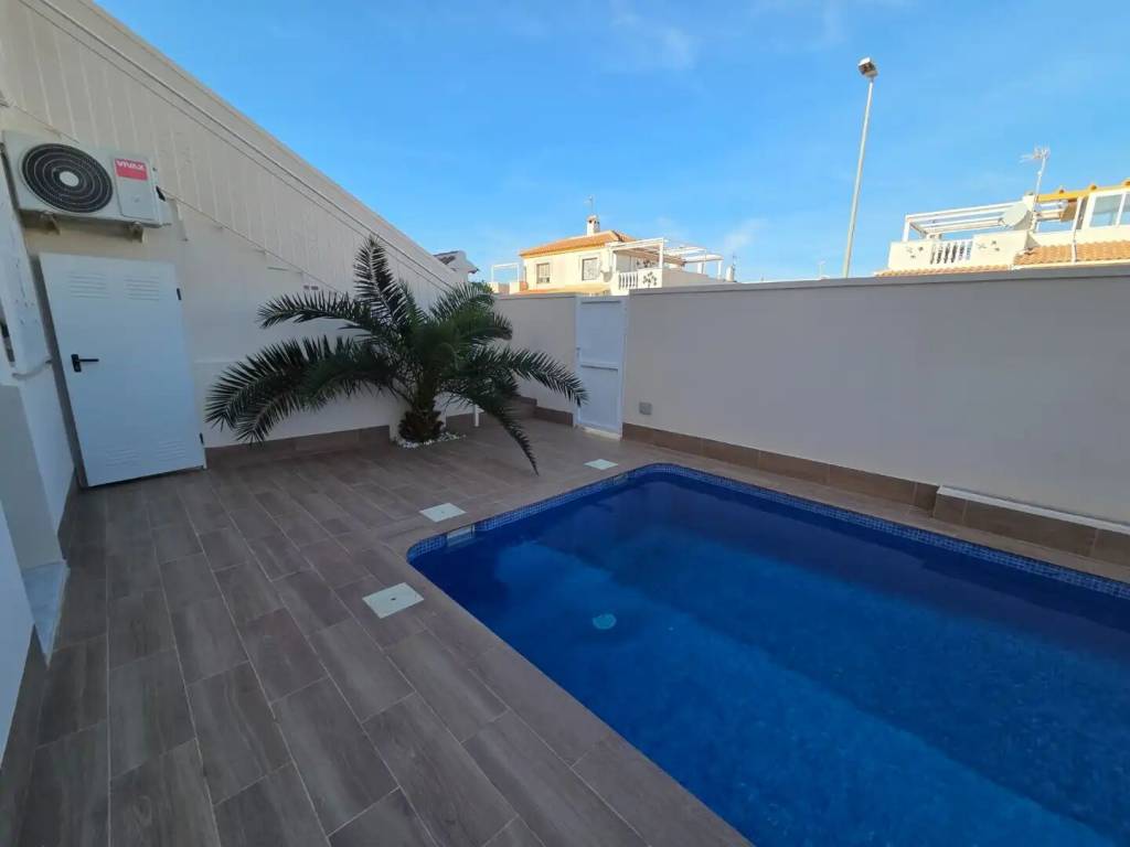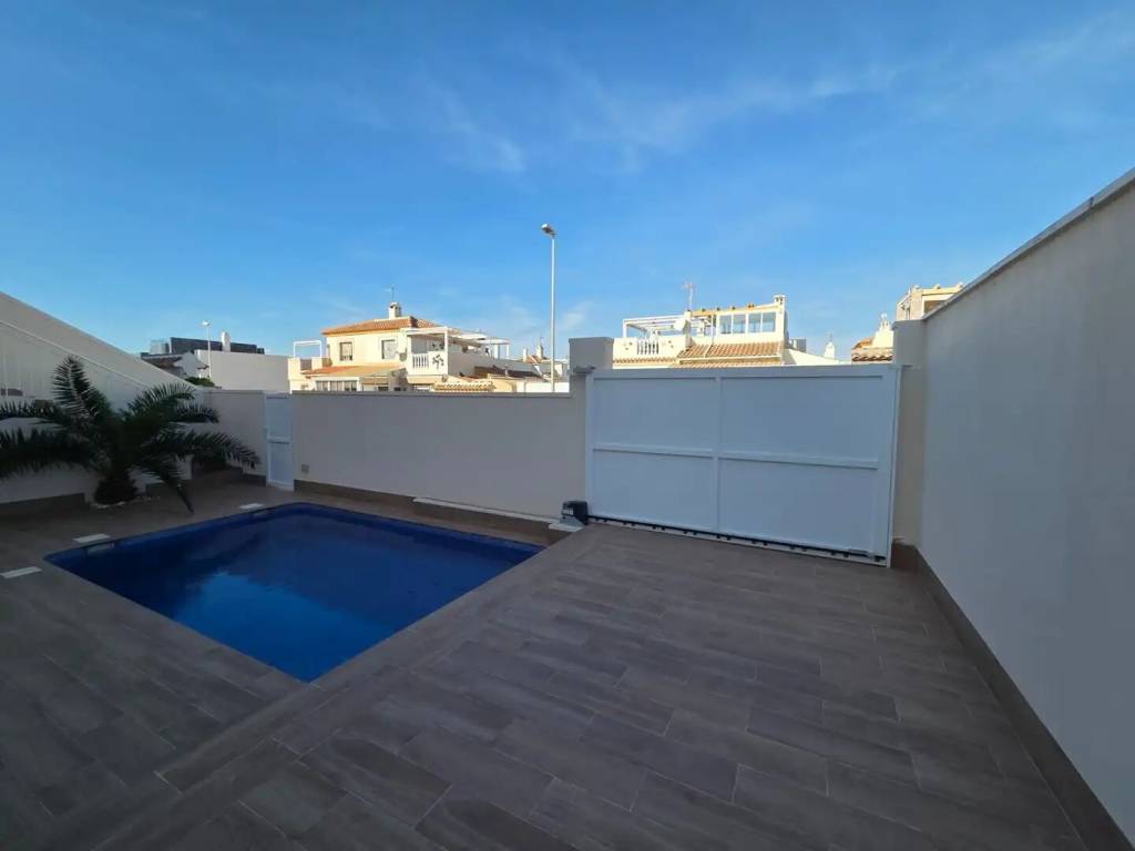 Se vende amplio, moderno y totalmente reformado chalet pareado con piscina privada en una zona muy demandada de Torrevieja. La vivienda se distribuye en 2 plantas más solárium privado. En la planta principal encontramos amplio salón, dos dormitorios grandes con sus baños completos. En la planta superior, a donde podemos acceder y por las escaleras de fuera y por la escalera interior, se encuentra amplio salón-comedor con cocina enorme y abierta, otros dos dormitorios, amplios y luminosos, junto con sus baños completos y una salida a gran terraza, desde donde se puede acceder al solárium, enorme y soleado. En total 4 dormitorios, 4 baños tiene la casa. Aire acondicionado calor frio, calefacción suelo radiante en todos los baños, se vende con muebles y electrodomésticos. El jardín de la casa está totalmente enlosado y tiene dos grandes trasteros. Todo pensado para ofrecer la máxima comodidad y seguridad. Además, hay hermosa piscina comunitaria.