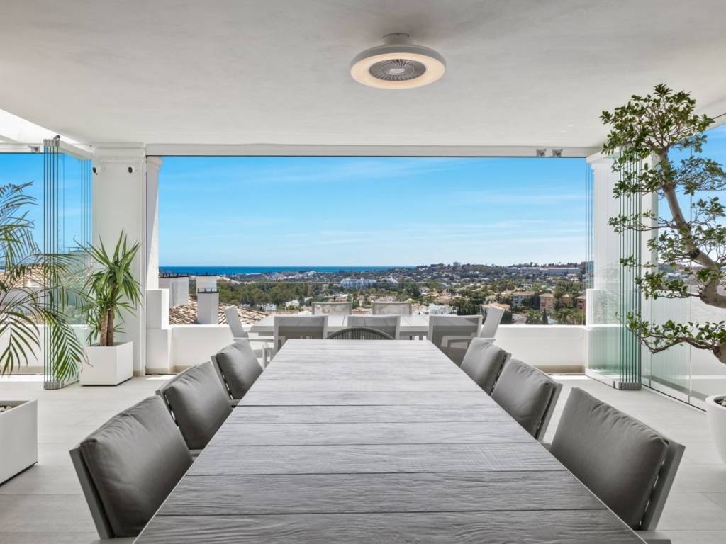 This truly unique and stunning 7-bedroom apartment offers an unparalleled level of luxury and privacy, nestled in an exclusive urbanization in Nueva Andalucía. This sought-after, secure community boasts only 53 bespoke apartments, making it a highly coveted address. Completed in 2020, the apartment has been meticulously built to the highest standards and showcases a contemporary design with a south-facing orientation, offering breathtaking views over the coastline and the sparkling Mediterranean Sea.Conveniently located, this gem is just a short drive from all essential amenities, including world-class beaches, the vibrant Puerto Banús marina, and Marbella's bustling town center, ensuring both tranquility and accessibility.Spanning an entire floor, the apartment is designed with privacy and comfort in mind. It features a private entrance that opens up into a spacious living area with a cozy fireplace, a sophisticated dining area, and an open-plan, fully fitted kitchen equipped with top-of-the-line Gaggenau appliances. With 7 bedrooms and 5.5 bathrooms, this property is perfectly suited for both large families and guests. The master suite includes a luxurious en suite bathroom with a dressing area, while the 6 additional guest bedrooms are accompanied by 4 beautifully appointed bathrooms, all outfitted with premium Villeroy & Boch fittings. There is also a convenient guest toilet.The property's standout feature is its expansive south-facing terrace, which functions as an outdoor haven for entertaining or relaxing. Complete with a summer kitchen, equipped with Napoleon appliances, a Jacuzzi, and glass curtains, the terrace seamlessly extends into a second living area designed for year-round enjoyment.Additional features include a cinema room for movie nights, a laundry area, and abundant storage. The apartment has garage space for three cars, with further storage options available, and the convenience of a private elevator that provides direct access from the garage to your home.As part of the community, residents enjoy access to meticulously landscaped gardens, three heated pools (two outdoor and one indoor), a sauna, a fully equipped gym, and an elegant clubhouse. The urbanization also offers 24/7 security and concierge services for ultimate peace of mind.Community Fees: 1,110 / month IBI Fees: 2,976 / yearThe apartment comes fully furnished, ready for you to move in and experience the epitome of luxury living. A must-see for discerning buyers!