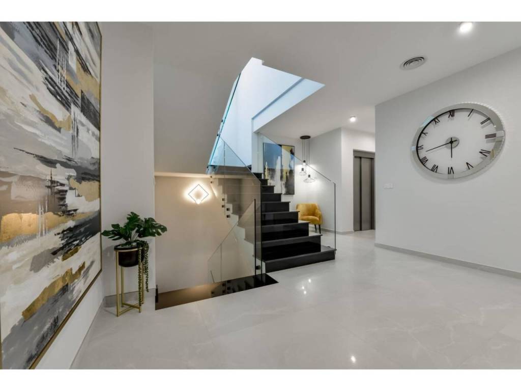 Arriving at the Urbanisation there is a natural stone wall with a height of 7 metres and the automatic access gates to the villa arriving at the covered garage at street level with double height, natural light and garden with palm trees of different heights of 180 m2, a glazed room of 78 m2 with lift, interior staircase, cloakroom and enough space to put armchairs, convert this space into an office or simply a waiting room for visitors.