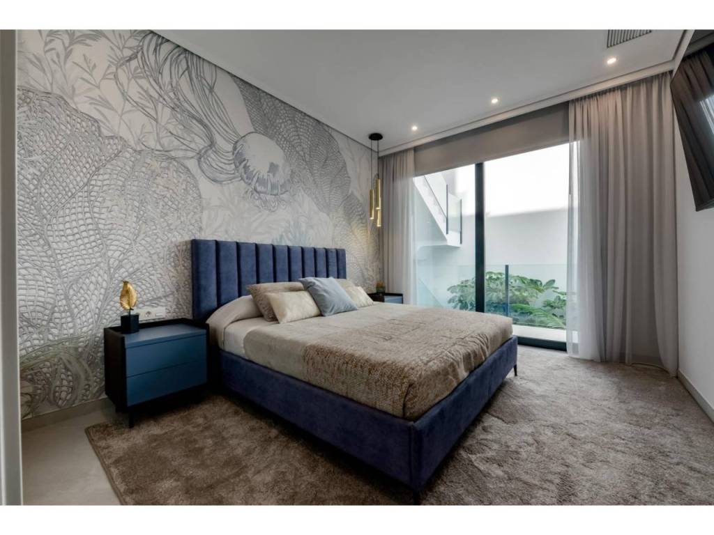 The next floor of 190 m2 of enclosed space is located below the plot level but 3 metres above the street level and therefore with natural light. It can be accessed by lift or staircase inside the villa, or by the staircase outside the garage, in the latter case you can only access the exterior corridors, the installations room or the main door of this floor, thus making the maintenance of the house without the need to enter inside the house. Inside this floor we will find 4 spacious bedrooms, living room with English patio of 17 m2 with the stairs to the plot, laundry, 2 bathrooms, exterior corridors of 40 m2 and installations room.