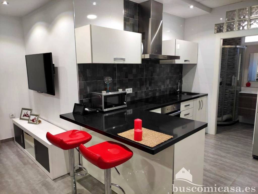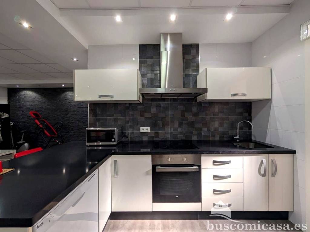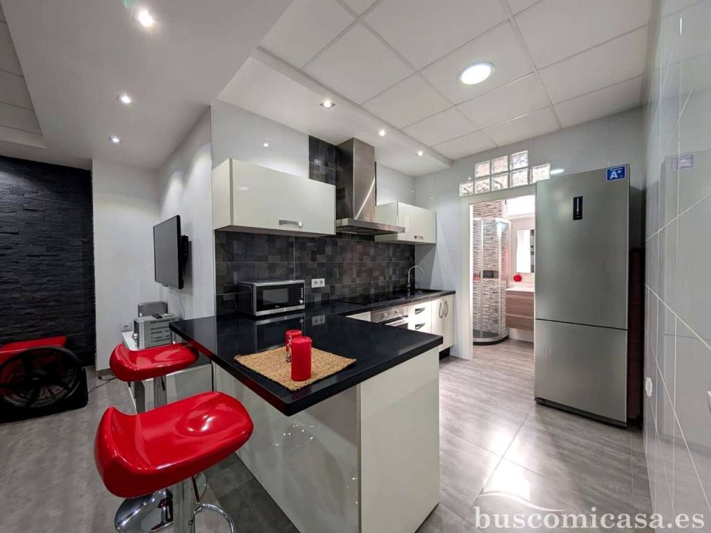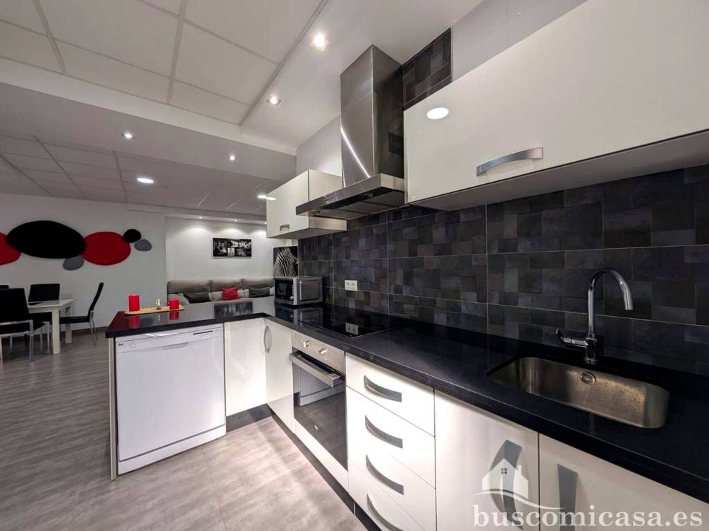La cocina americana, completamente amueblada, facilita la preparación de alimentos y la interacción con clientes o empleados.