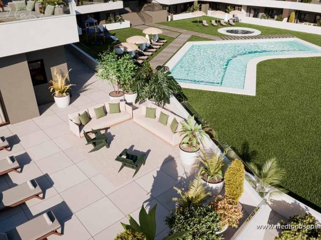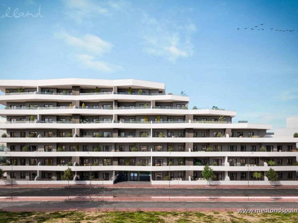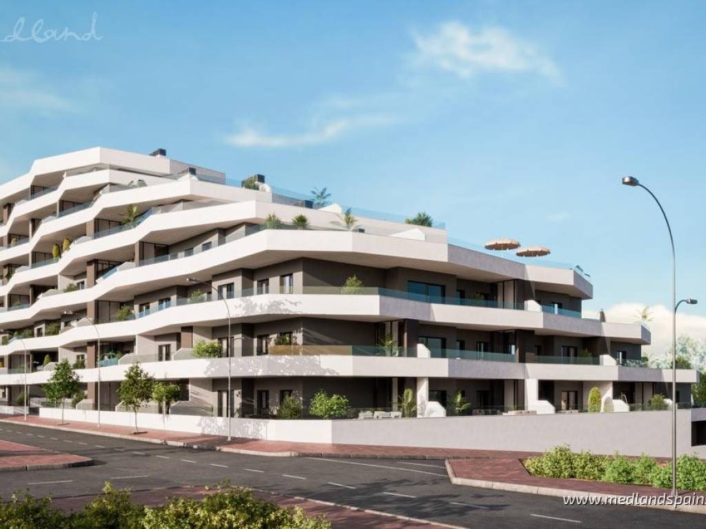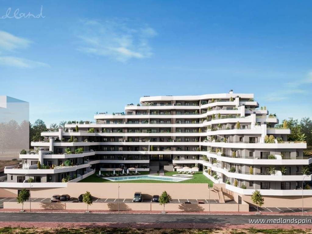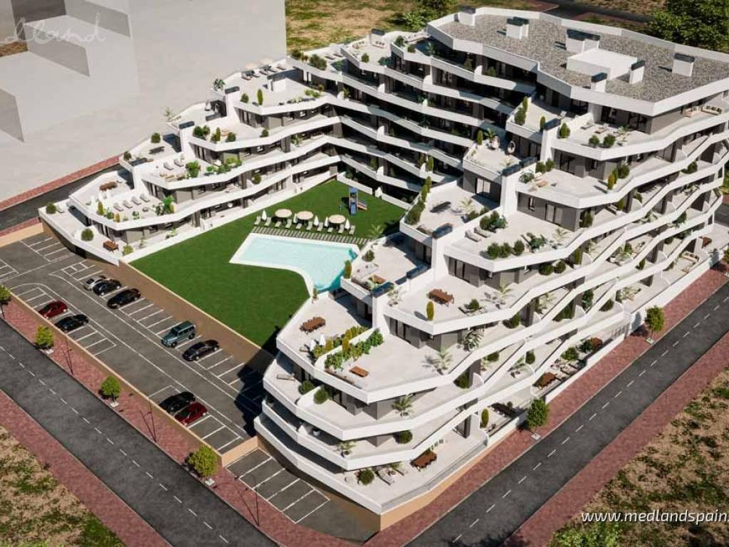 New apartment complex in a residential area of San Miguel de Salinas, only 15 minutes' drive from the Blue Flag Beaches ofthe Orihuela Costa. The area is also surrounded by some of the most prestigious golf courses, likeLas Colinas Golf, Villamartín, Real Club de Golf Campoamor y Las Ramblas Golf. The town itself providesall the necessary daily services, with an excellent road network, connecting it to the region's main tourist areas, like Torrevieja and Orihuela Costa, as well as the airports of Alicante and Murcia, which are both only 50 minutes away.This impressive apartment complex comprises apartments with 2 or 3 bedrooms and 2 bathrooms. All apartments present an open plan living area, combining the kitchen, dining area and lounge in a single space, with windows that open onto the terrace. Some apartments are available with a large terrace of between 60m2 to 140m2. Depending on the location within the complex, some apartments enjoy views of the central community area or the surrounding landscape. Each apartment includes pre-installation for air conditioning, fitted wardrobes, and a parking space. For an extra price, it is possible to purchase a storage unit.This is a closed complex, ensuring residents can enjoy the communal facilities in a secure and private environment. These fantastic facilities include a large pool for adults and a splash pool for children, bio-healthy gym equipment, childrens playground, and outdoor or underground parking spaces.
