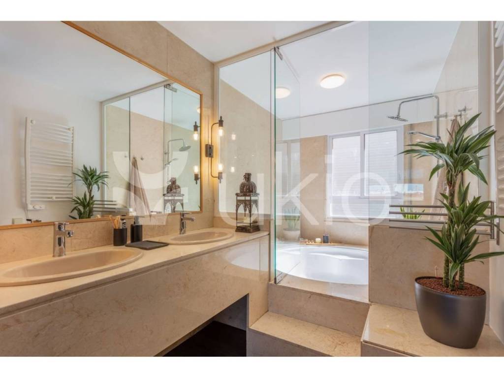 It has two bedrooms with double beds and two bathrooms, one separate with a spa-style shower and the other en suite with a whirlpool tub and double sink. The living room includes a dining area for seven people and a workstation with views of the city. The kitchen is fully equipped and has an L-shaped breakfast nook.