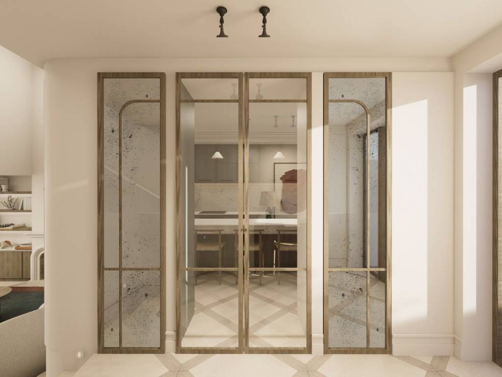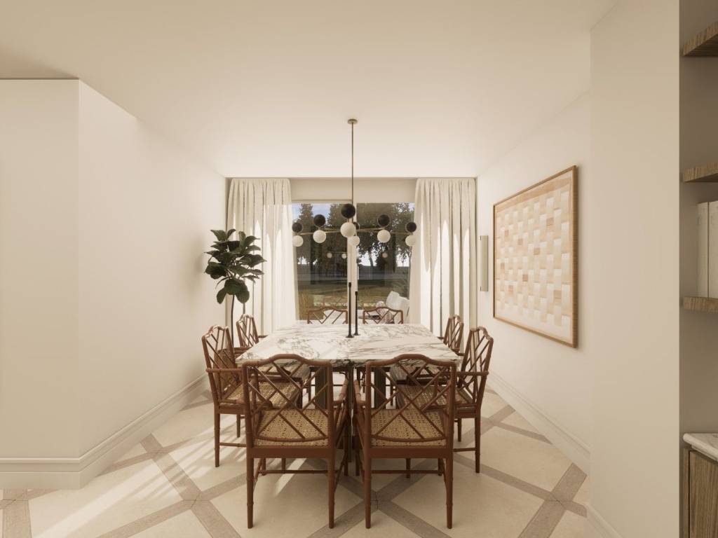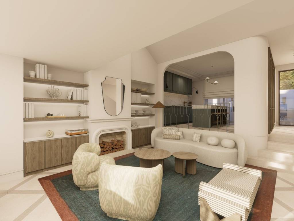 The interior features a bright and open-plan layout that connects the contemporary kitchen, dining, and living areas, creating a spacious and inviting atmosphere. Natural light flows through large windows, enhancing the elegant finishes and clean design.