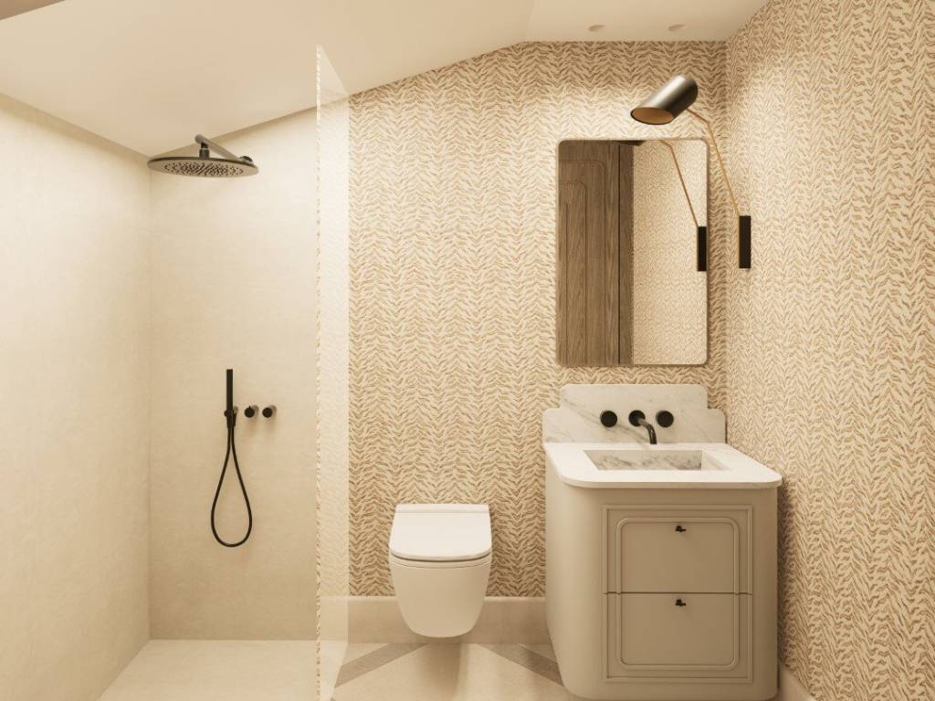 The layout is both practical and ideal for guests or family living. On the entrance level, you’ll find one double bedroom and a bathroom — perfect for visitors or those who prefer single-level living. Upstairs, there are two further bedrooms, both with ensuite bathrooms, and direct access to a private terrace that offers panoramic views over the surrounding hills and urban landscape of Nueva Andalucía.