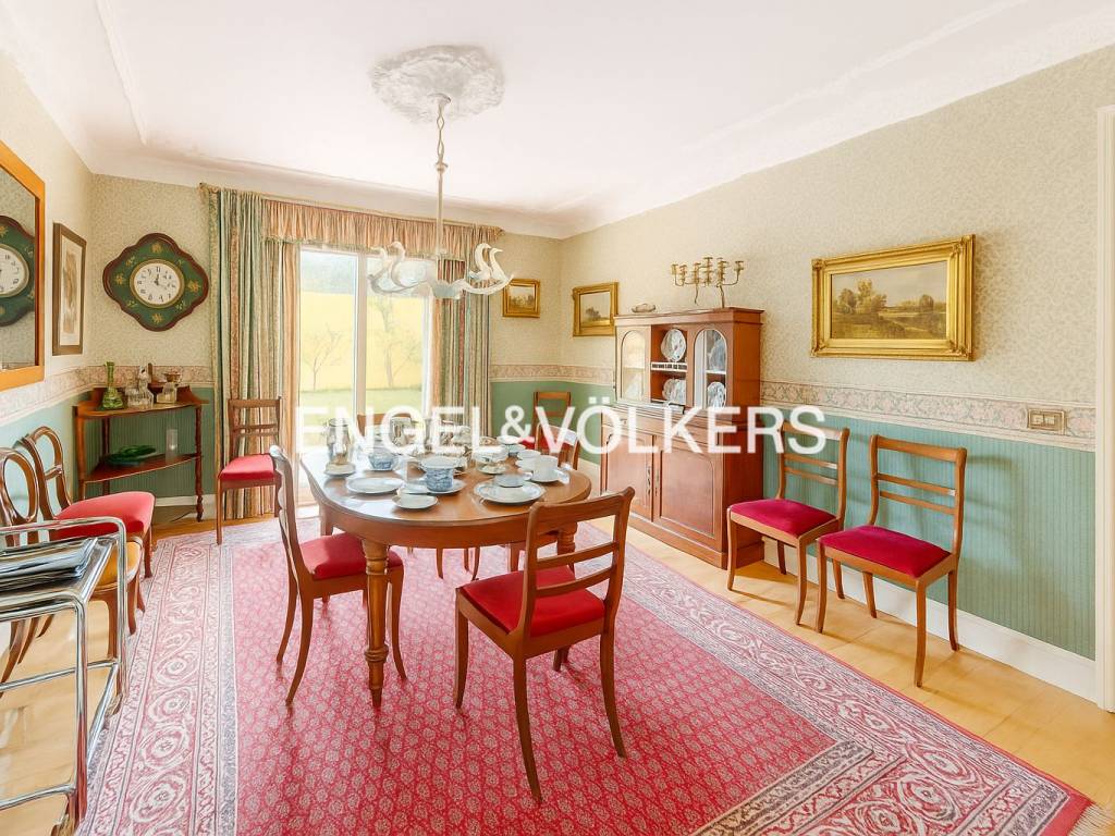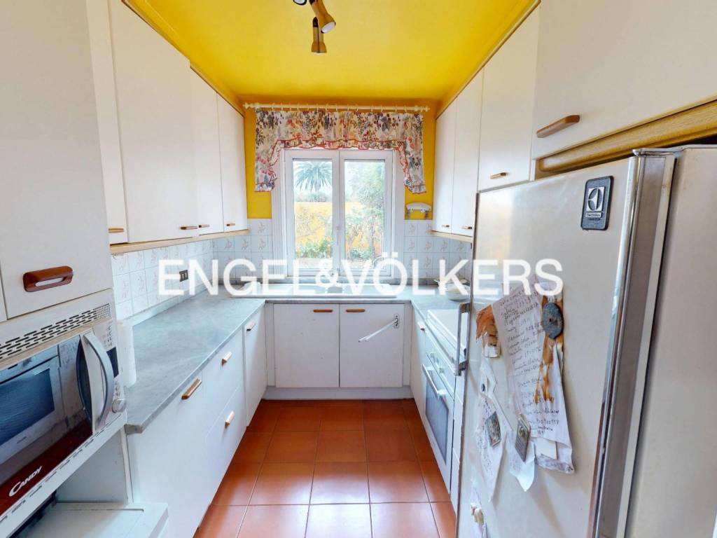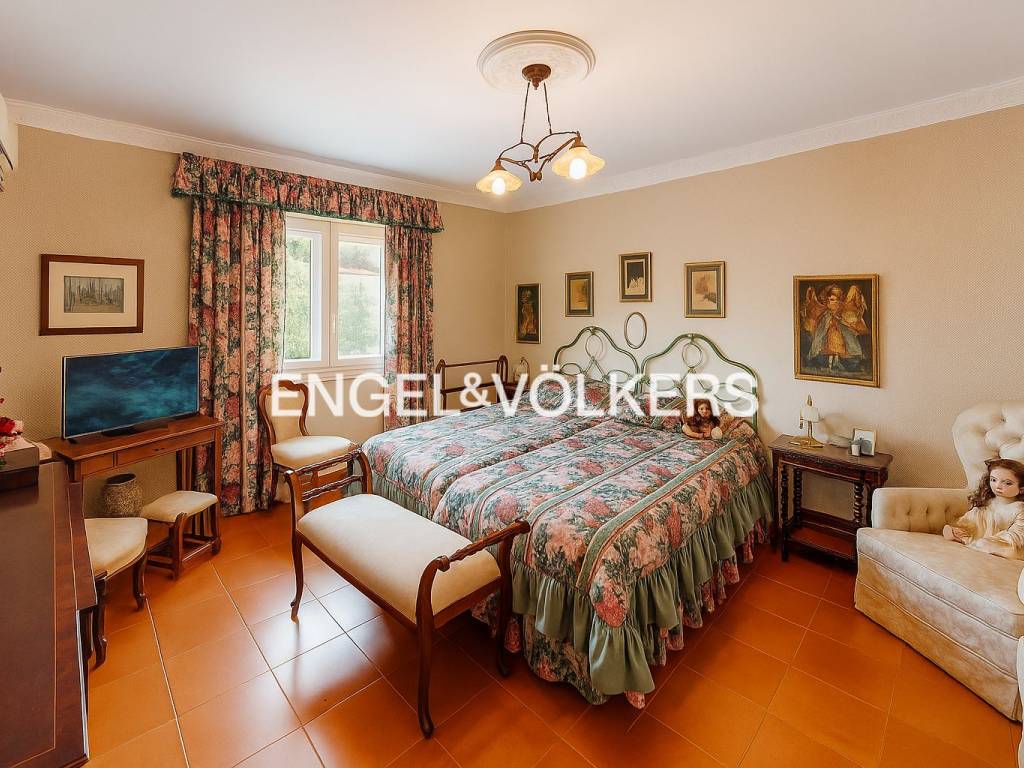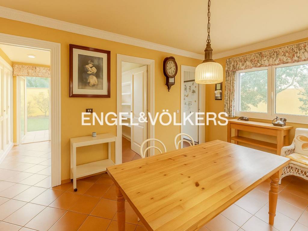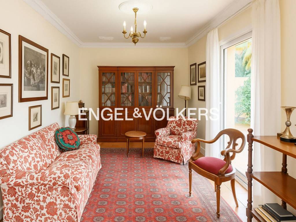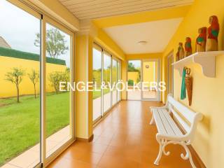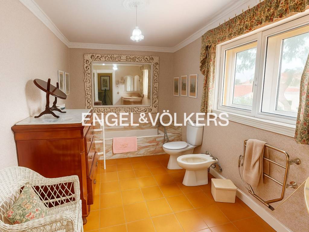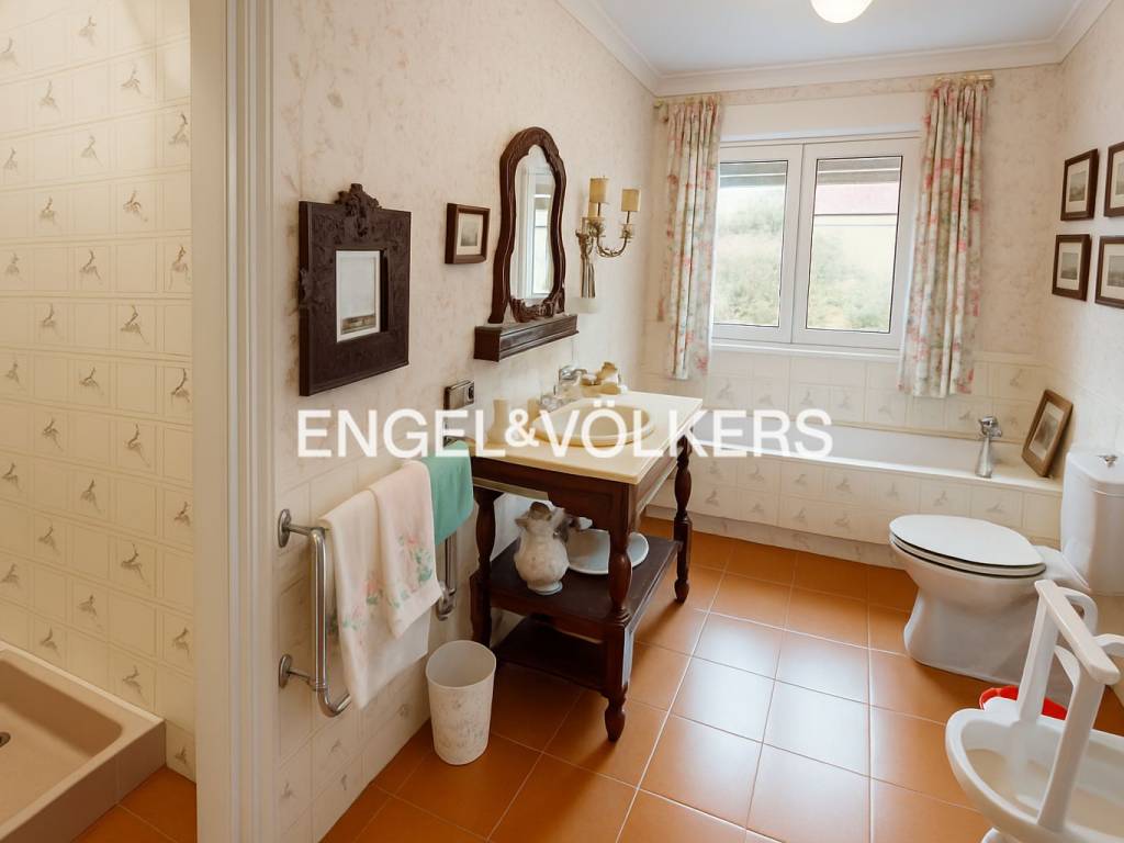 The house has a built area of 300 m2, on a plot of more than 800 m2. It is distributed over two levels. On the ground floor are the guest toilet, the large living room dominated by an interesting fireplace, the dining room, and a sitting room with access to a magnificent glazed porch, which brings brightness and freshness by allowing the house to face the delicate ornamental garden.