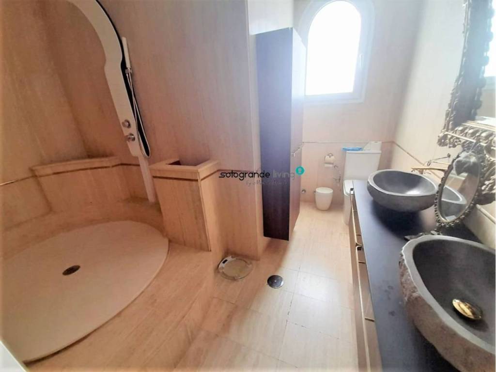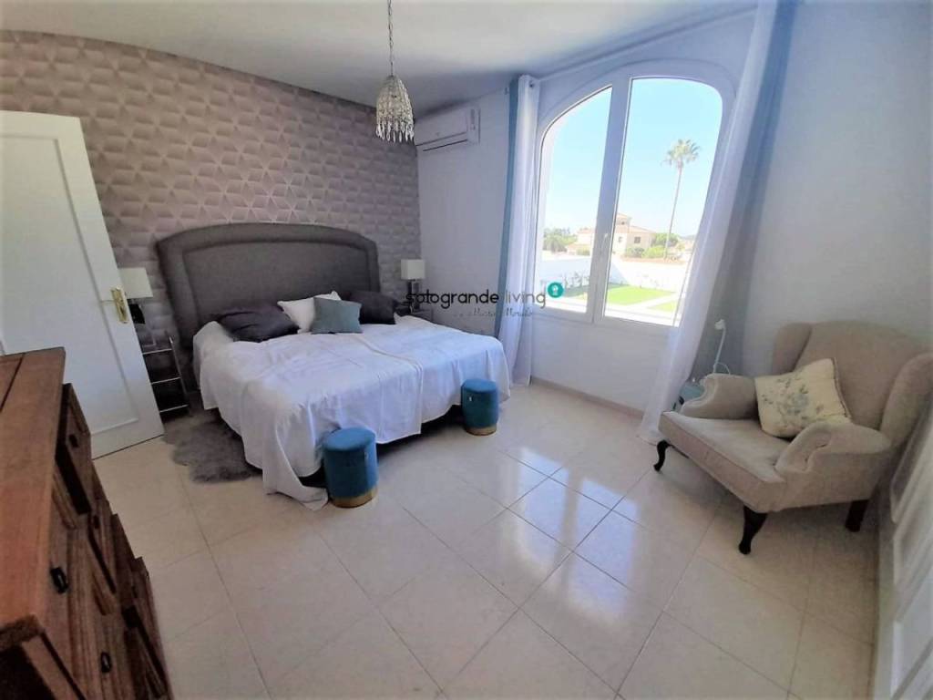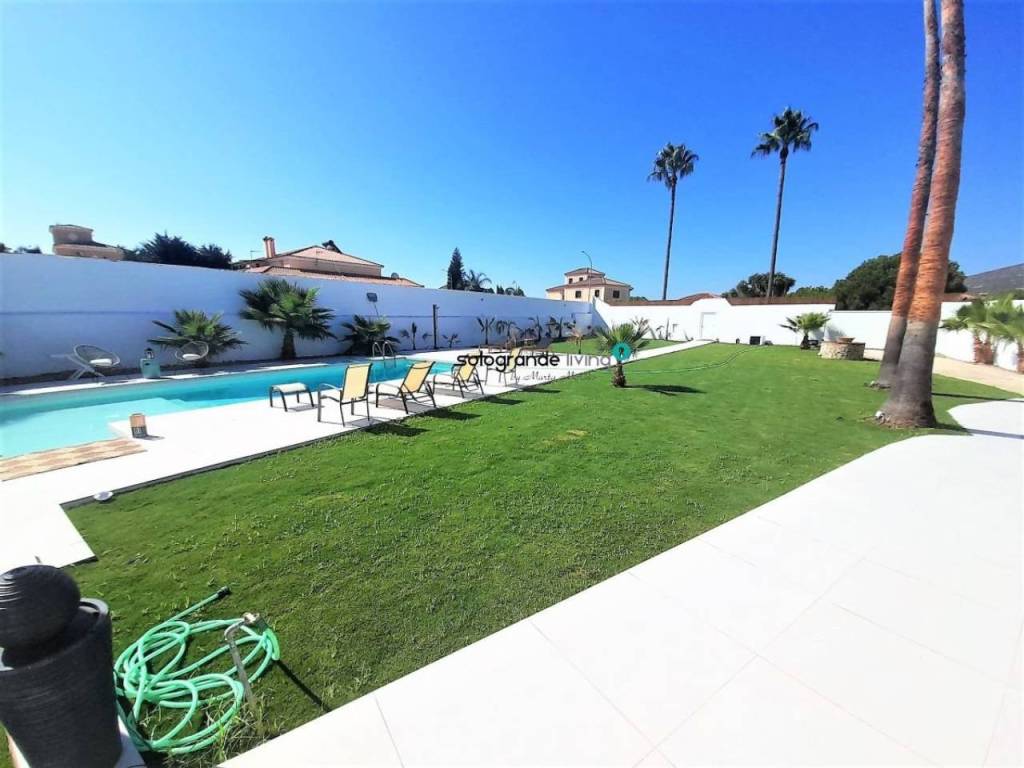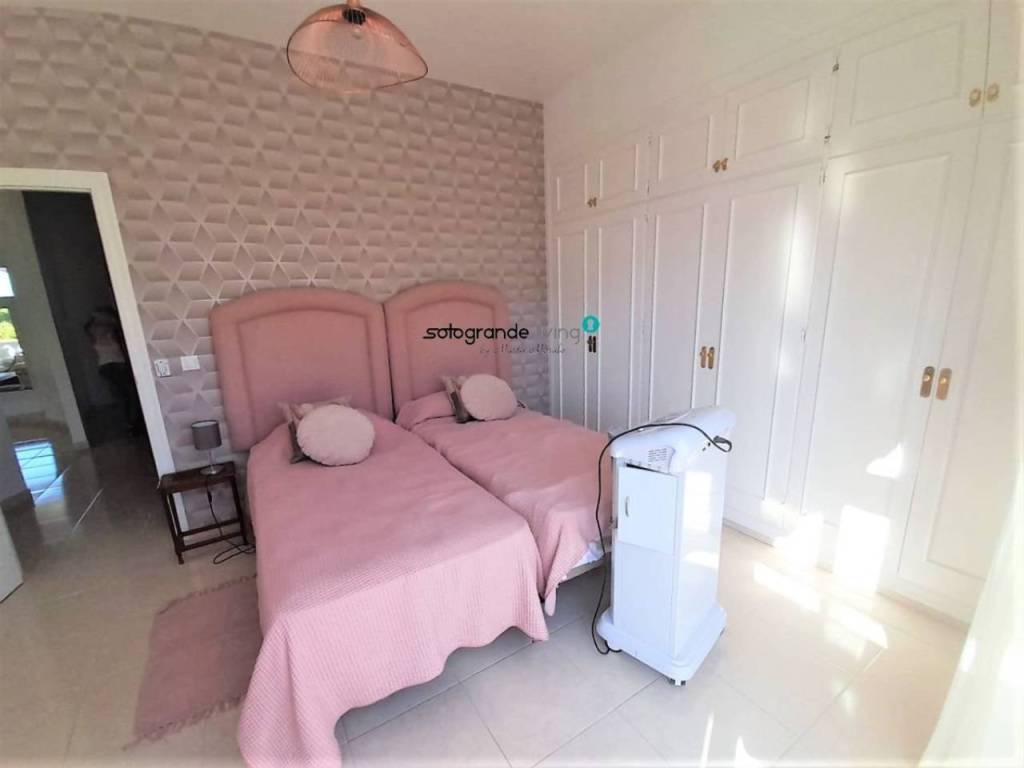 Preciosa villa recién reformado en Santa Margarita, La Línea de la Concepción, cuenta con tres plantas, una escalera central que se bifurca en caracol hacia la primera planta , 9 dormitorios, 4 baños ( 2 en suite) y un amplio jardín de 1300 m2 con piscina y barbacoa. Planta baja, vestíbulo, salón-comedor ( en dos niveles y con chimenea) , cocina amueblada a negociar (con tres hornos, isla), baño, lavandero y porche. Planta alta, dormitorios, baños, vestidor, torreón, planta sótano. Cuenta con sistema seguridad, aire acondicionado, calefacción centralizada y portero automático.