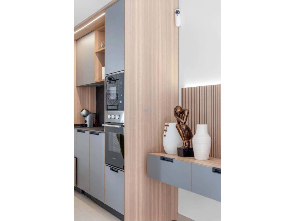 El interior de las viviendas está diseñado con atención al detalle y equipamiento de alta calidad. Todas las propiedades vienen amuebladas, lo que facilita la mudanza y el inicio de una nueva vida. Los suelos de gres porcelánico aportan un toque de elegancia y durabilidad. Además, cuentan con aire acondicionado para asegurar el confort en todas las estaciones. Las persianas eléctricas y el videoportero añaden un nivel extra de comodidad y seguridad. Los armarios empotrados optimizan el espacio de almacenamiento, mientras que los electrodomésticos incluidos hacen que la cocina esté lista para su uso desde el primer día. La distribución interna ofrece opciones de 2 o 3 dormitorios y 2 baños, adaptándose a diferentes necesidades familiares.