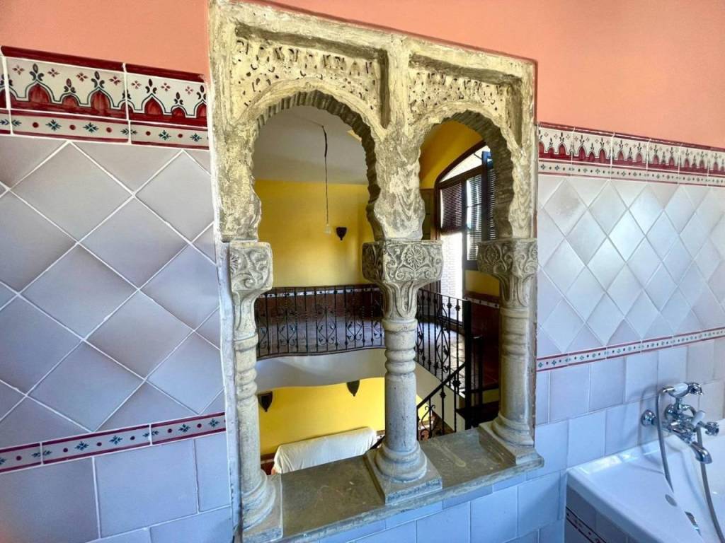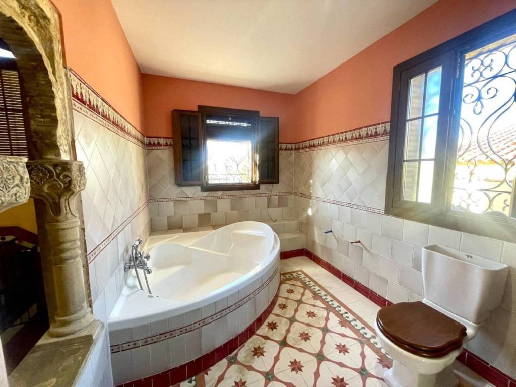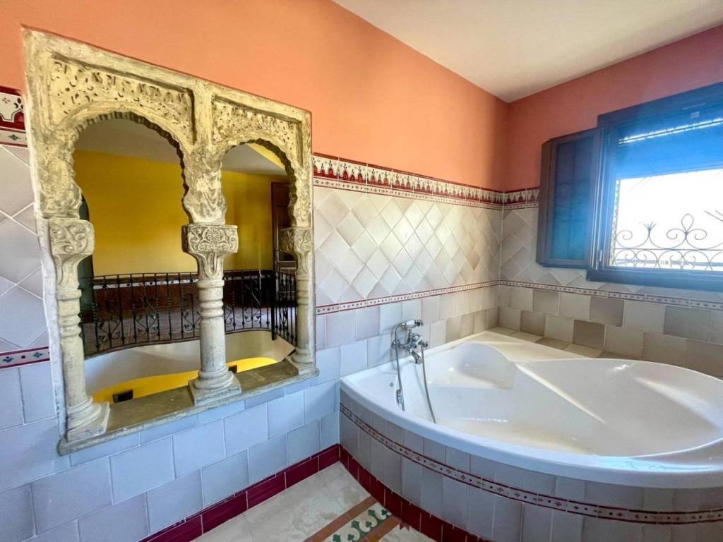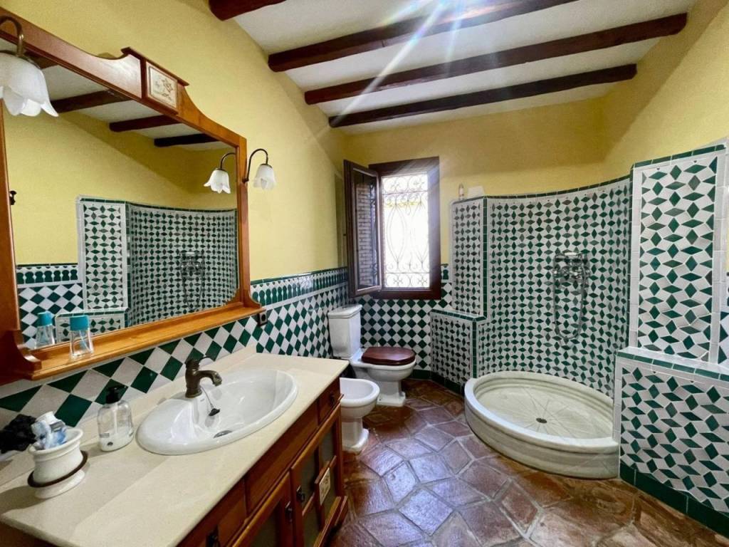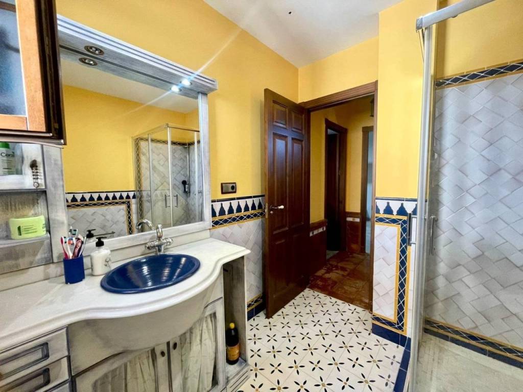 El baño completo presenta azulejos seleccionados personalmente por la propietaria manteniendo os motivos andaluces y árabes; además cuenta con plato de ducha redondo fabricado en mármol blanco. Acceso desde la propiedad a un amplio garaje , con espacio para vehículo y almacenaje.