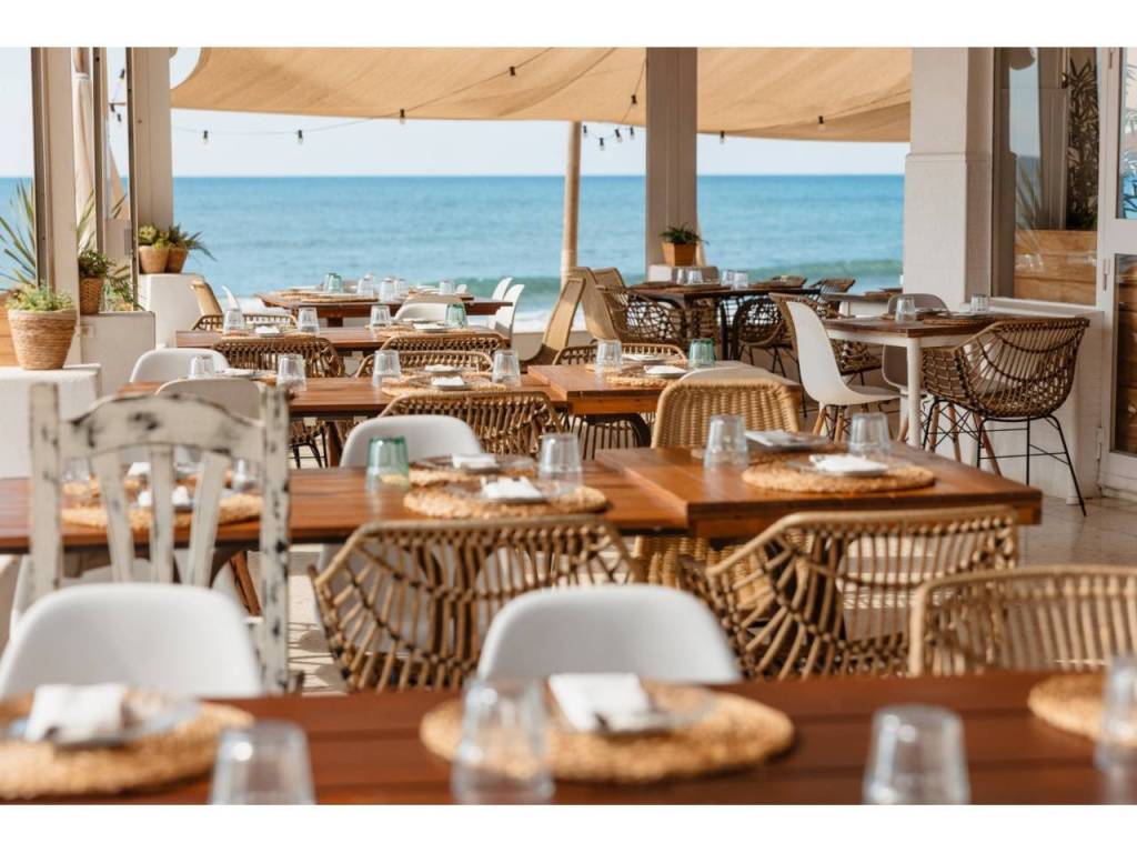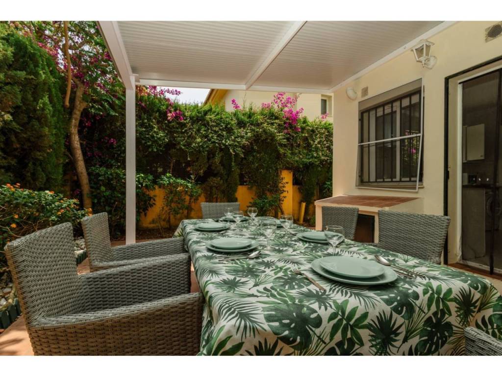 The fully fitted kitchen includes all modern appliances: refrigerator, freezer, multifunctional oven, microwave, cooker, filter coffee machine, toaster, and water boiler, plus comprehensive kitchenware, crockery, and glassware. Direct access from the kitchen leads to the spacious outdoor terrace with large dining table seating eight, perfect for al fresco dining with family and friends.