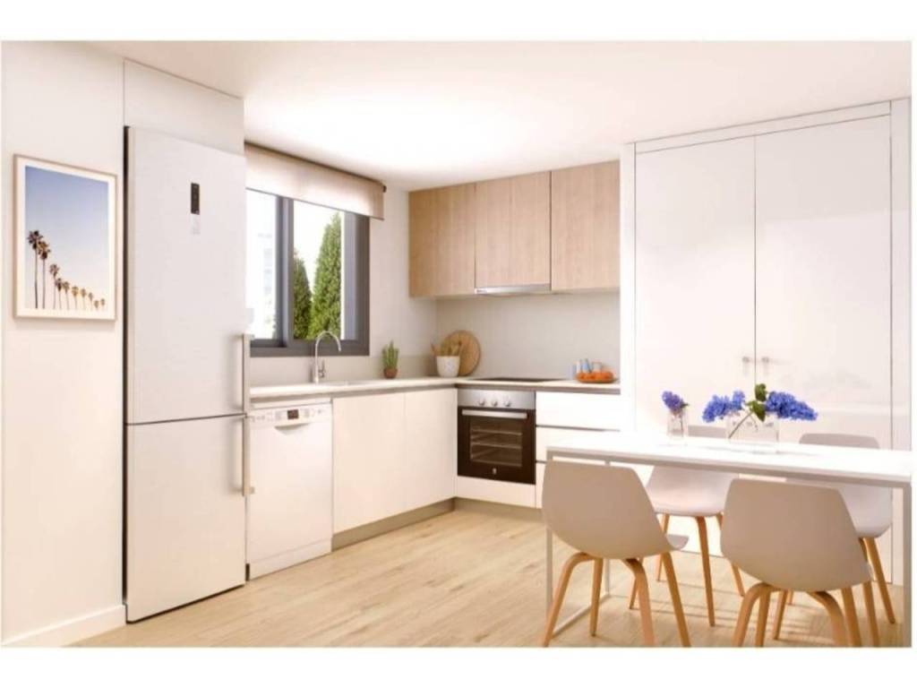 Las viviendas incluyen cocina amueblada con muebles altos y bajos y equipada con placa de vitrocerámica, horno eléctrico, microondas y campana extractora. Además, cuenta con sistema de climatización Frío/Calor mediante conductos con rejillas y producción de agua caliente sanitaria mediante sistema de Aerotermia.