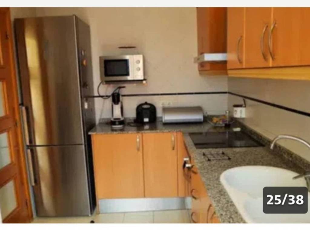 Cocina independiente totalmente equipada (vitrocerámica, horno, microondas, frigorífico, lavadora, cafetera, menaje completo).