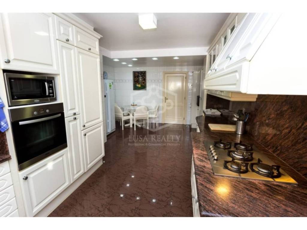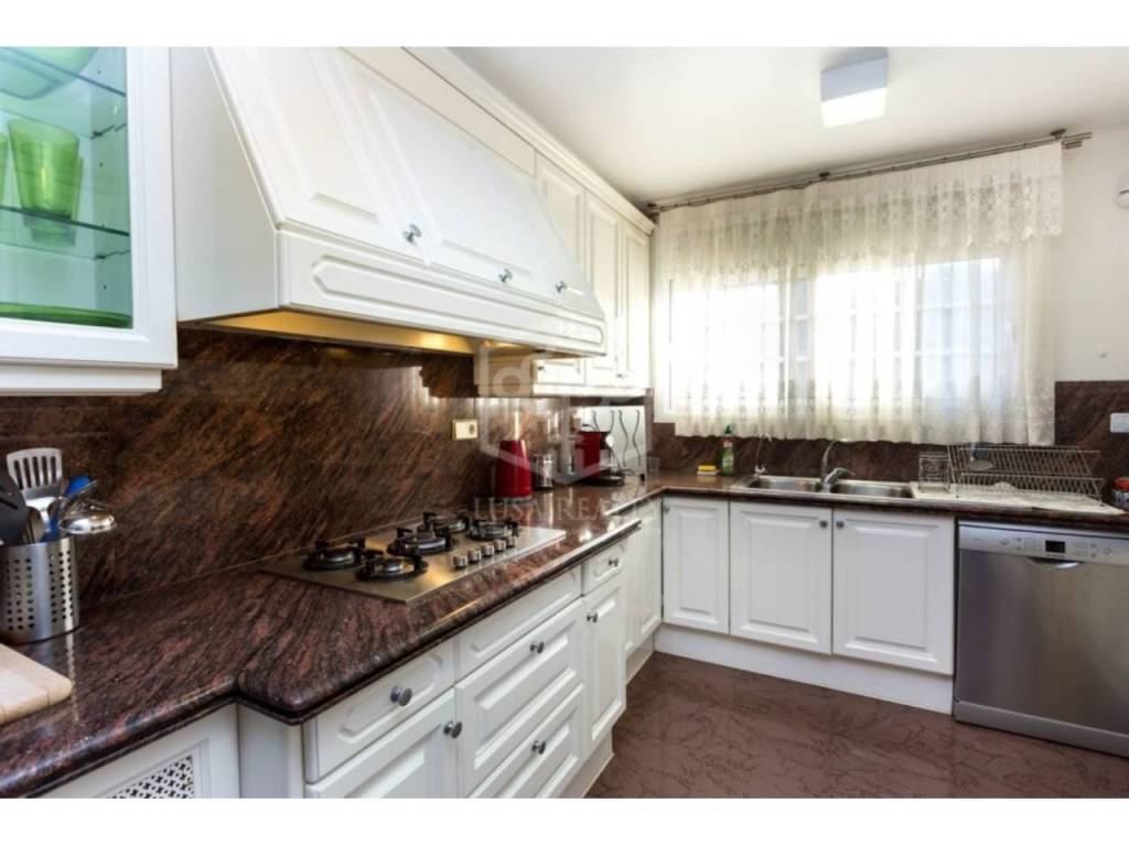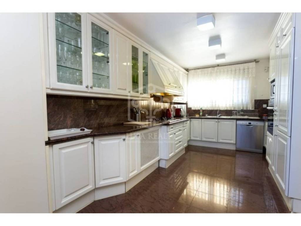 Большая гостиная площадью 120 м2 плавно переходит в столовую, все окна в пол с выходом на террас. Из столовой можно попасть в кухню 30 м2, оформленную в коричнево-бежевых тонах. На первом этаже дома имеется гостевой туалет.