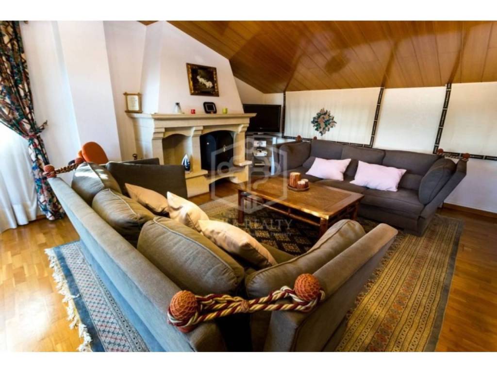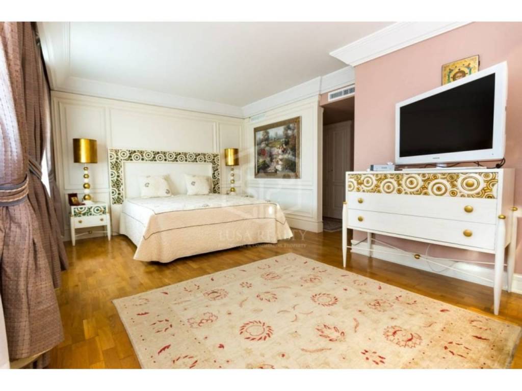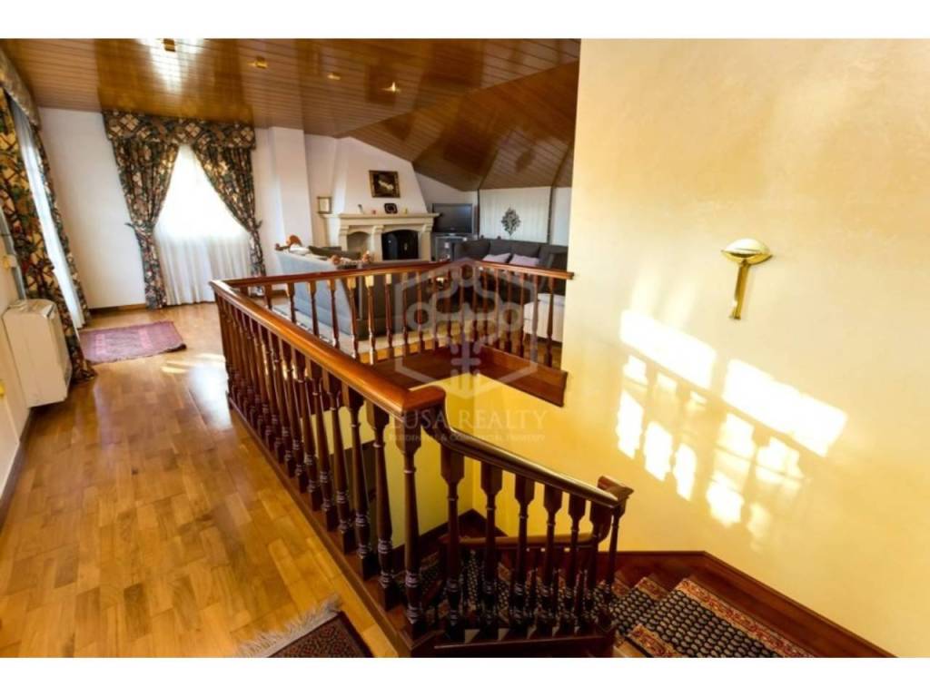 Широкая лестница ведет на второй и третий этажи. На втором этаже расположились 2 сьюта и 2 спальни, 1 ванная комната. На последнем этаже дома – гостиная с камином, и терраса 24 м2 с джакузи и видами на зеленый ковер сосновых шапок и море. На этом же этаже есть гостевой сьют и кабинет.