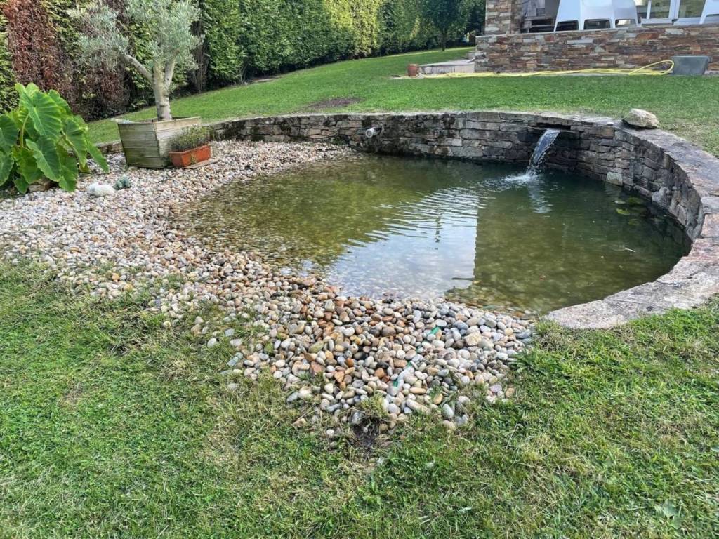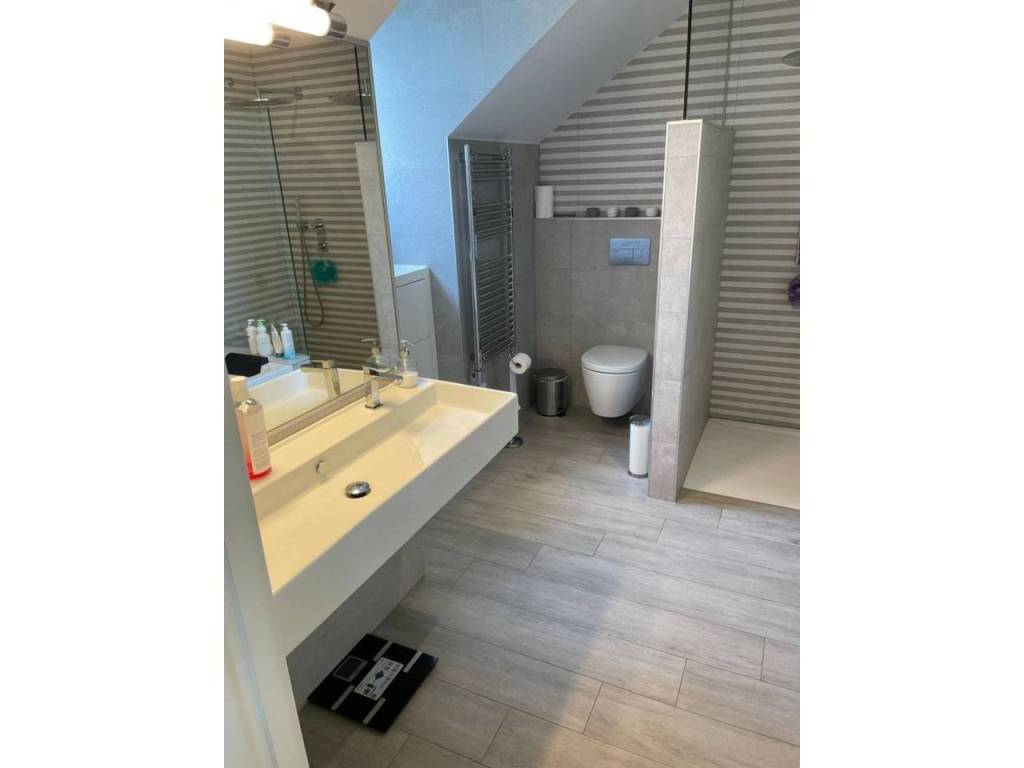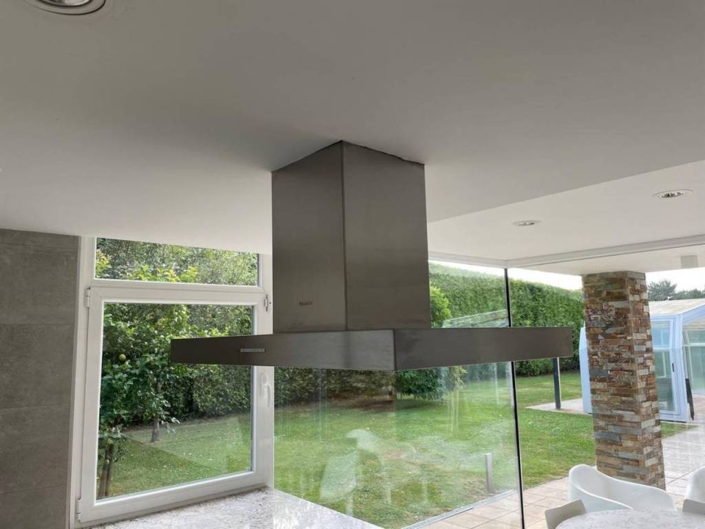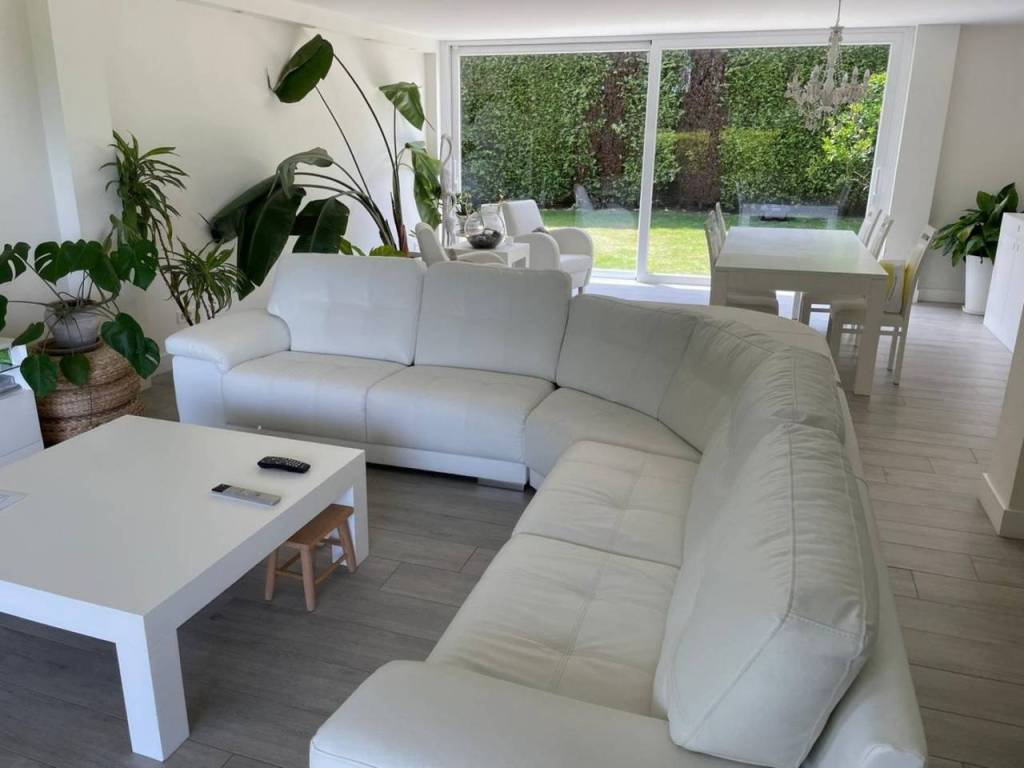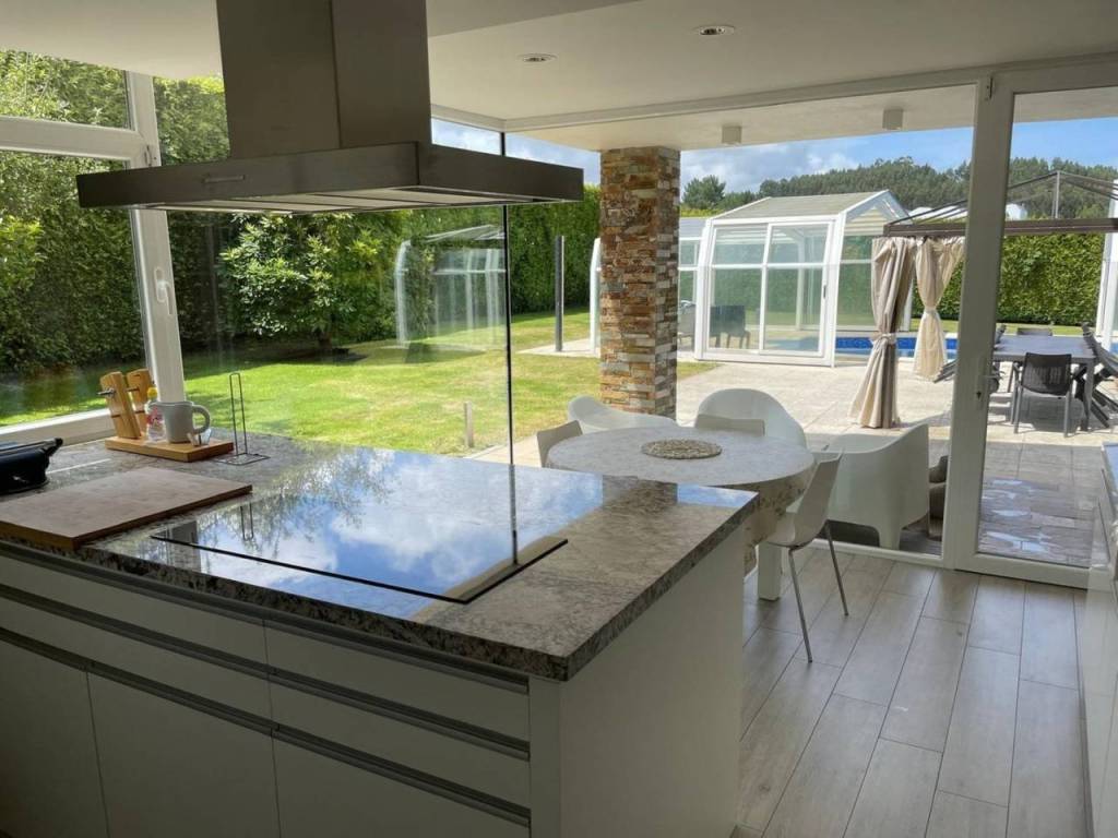 The house boasts spacious areas that invite togetherness, including a bright living room with garden views and a modern kitchen with an island and appliances from the prestigious Miele brand.