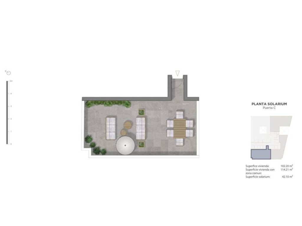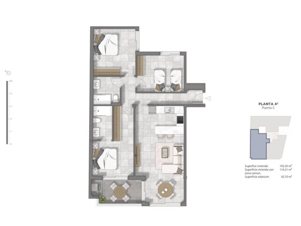 This penthouse comprises 3 bedrooms and 2 bathrooms, an open-plan kitchen, a living room, a terrace, and a private solarium.