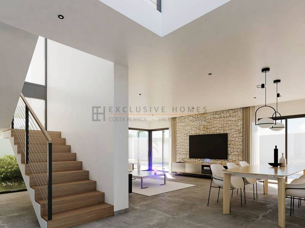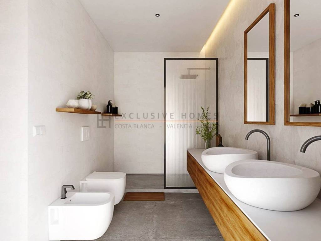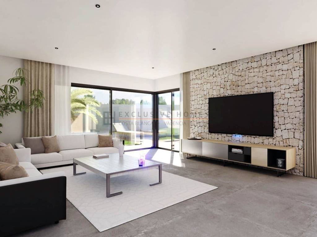 Newly built luxury detached villa with four bedrooms, four bathrooms, a guest toilet, a large living-dining room and kitchen with island, a terrace, a sun terrace, a private pool, a garden, parking, and a garage, all built with top-quality sustainable materials.