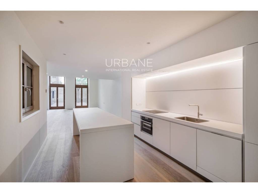 Cuando entramos al piso, nos encontramos en un pequeño recibidor que da acceso a la cocina abierta. La cocina está completamente equipada con electrodomésticos y acabados de alta gama. Si continuamos, encontramos el salón comedor, que tiene un techo abierto a la segunda planta con grandes ventanales que da sensación de amplitud y mucha luminosidad. Desde el comedor se accede a la amplia terraza que da a la tranquilidad del patio interior de la manzana. La terraza dispone de barbacoa y cocina exterior.