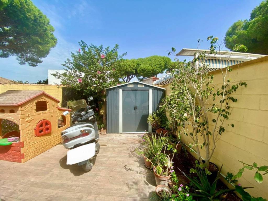 La zona exterior lateral tiene un trastero prefabricado y encimera de obra con fregadero.