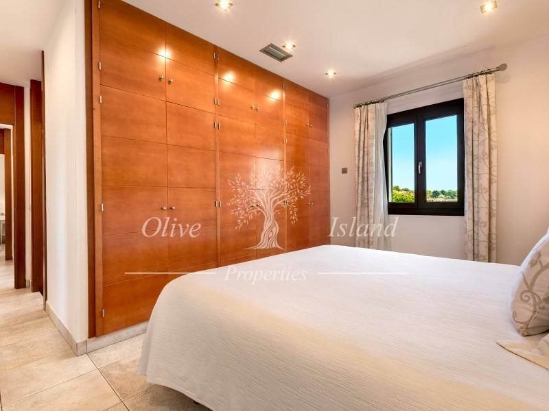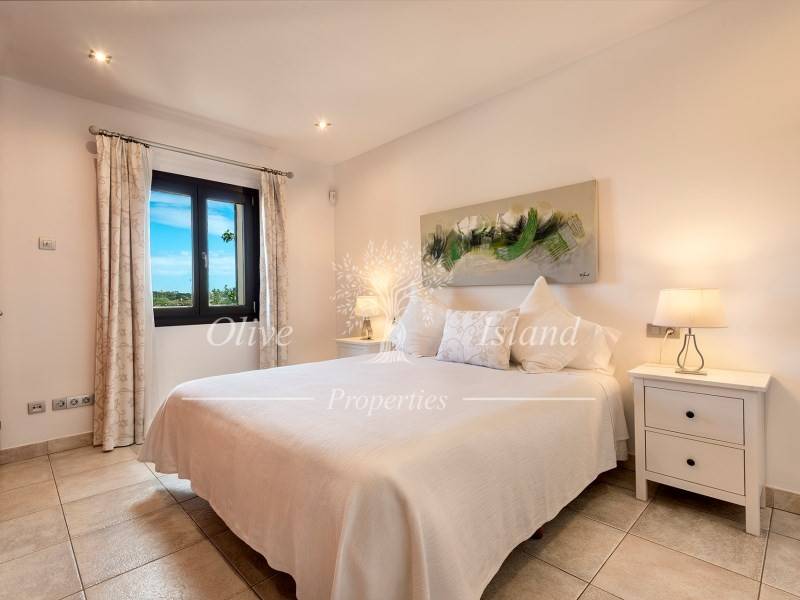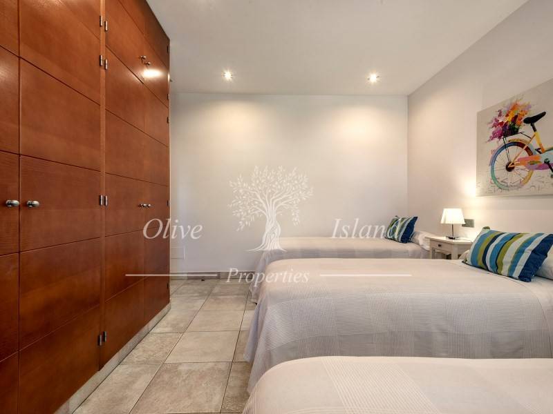 It features a spacious living and dining area with a fireplace and direct access to the porch, garden, and pool area. The fully equipped kitchen includes two bedrooms (one double and one triple), as well as two full bathrooms, one of which is en suite.