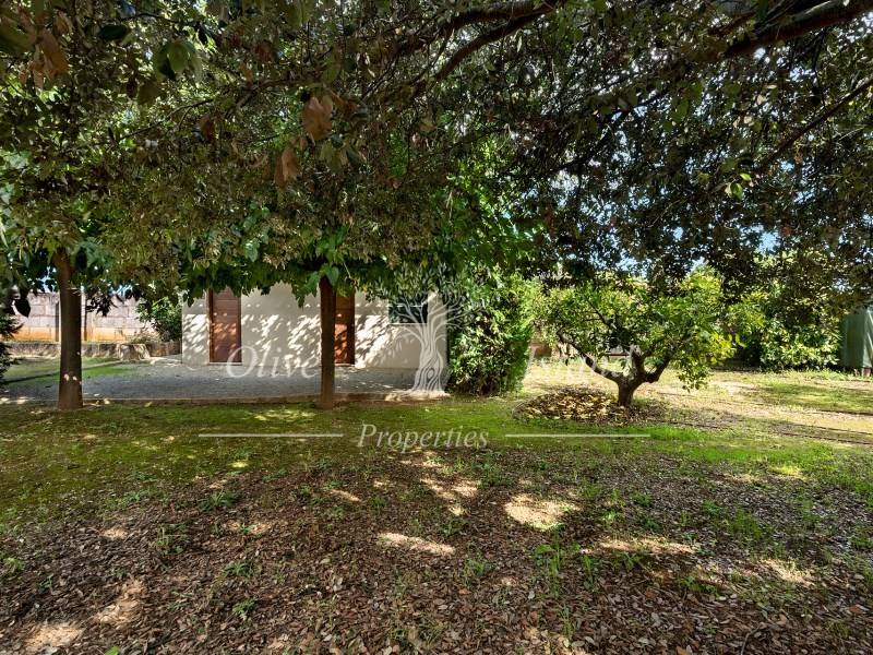 The surrounding landscape is adorned with vegetation, including cypresses, olive trees, holm oaks, and various fruit trees, such as orange, lemon, mandarin, and pomegranate trees.