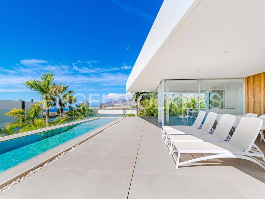 In the exclusive Abama Golf Resort, in Guía de Isora, is this impressive luxury villa that combines modern architecture, spaciousness, and spectacular views of the ocean and La Gomera. Distributed over three floors connected by an elevator, the property features five bedrooms and five bathrooms, four of them en suite, all with access to private terraces. On the upper floor, there is an elegant master suite with a marble bathroom, standalone bathtub, and Italian shower, as well as a spacious living area with a fully equipped designer kitchen, dining room, and living room open to a panoramic terrace with a heated infinity pool. The ground floor offers four bright bedrooms, surrounded by a tropical garden with palm trees and native vegetation, while the lower level houses a garage for several vehicles, a multipurpose room, laundry room, and technical area. Equipped with air conditioning, integrated lighting, and high-end furniture, this villa offers maximum comfort and elegance in an environment of absolute privacy. It is part of the Abama Golf Resort, a luxury enclave that features an 18-hole golf course, Michelin-starred restaurants, a spa, a beach club, and the iconic The Ritz-Carlton Abama hotel. A unique property for those seeking to live in luxury with discretion and style, in one of the most exclusive locations in Tenerife.