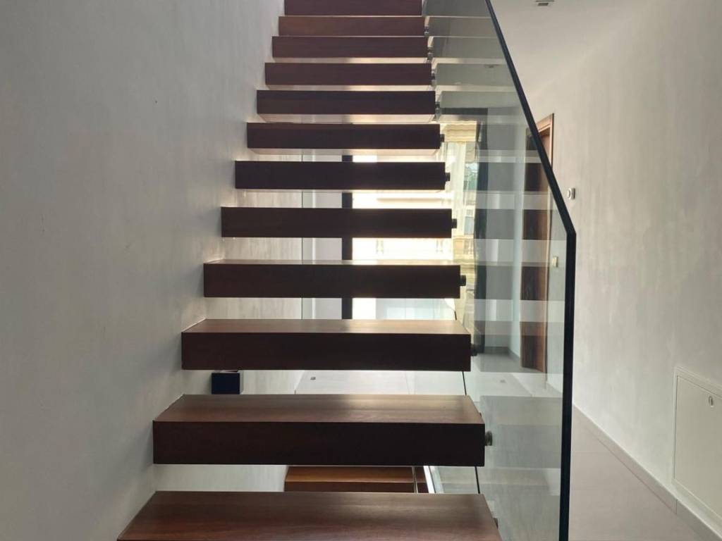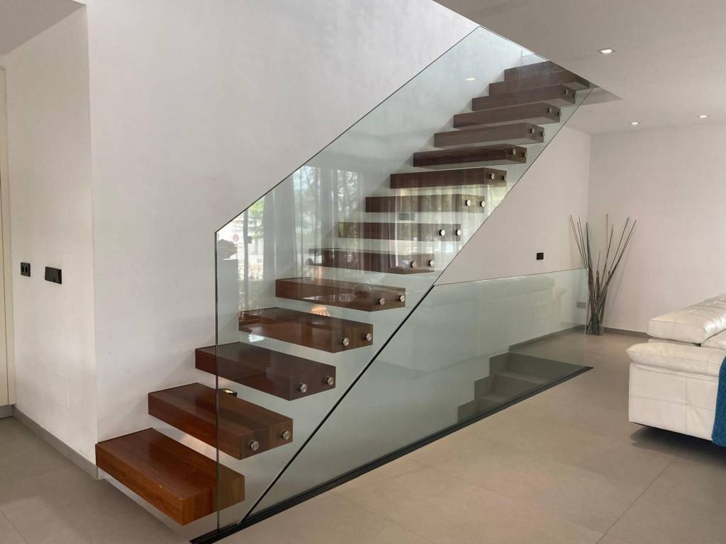 An open wood and glass staircase leads to the first floor, where there are three bedrooms and two bathrooms.