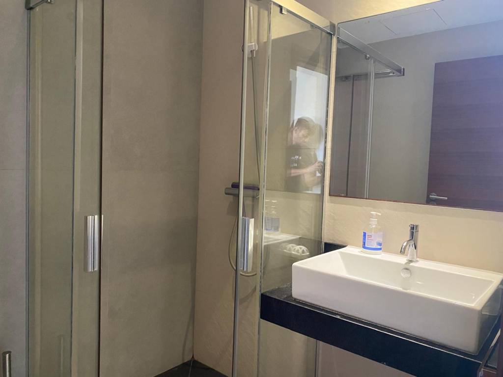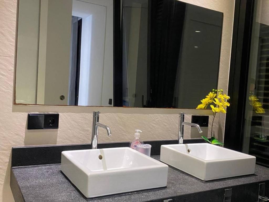 The open-plan ground floor has a living area equipped with Wi-Fi, satellite TV and large sofas. There are two glass walls that go from floor to ceiling.