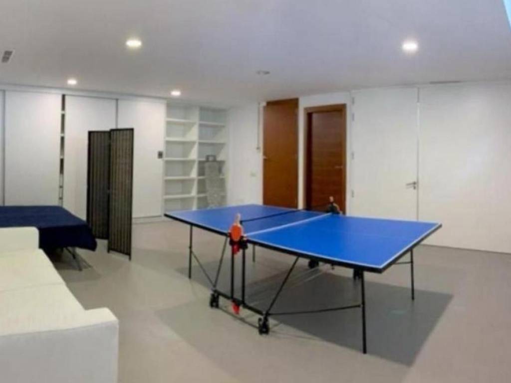 The basement has been converted into a living area with a ping pong table and dart board. Additionally, there is a comfortable sofa and two additional single beds. There is also another bathroom.