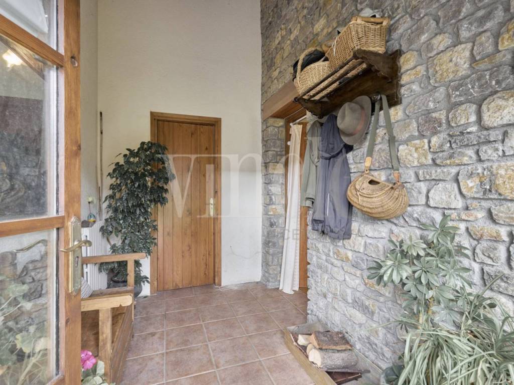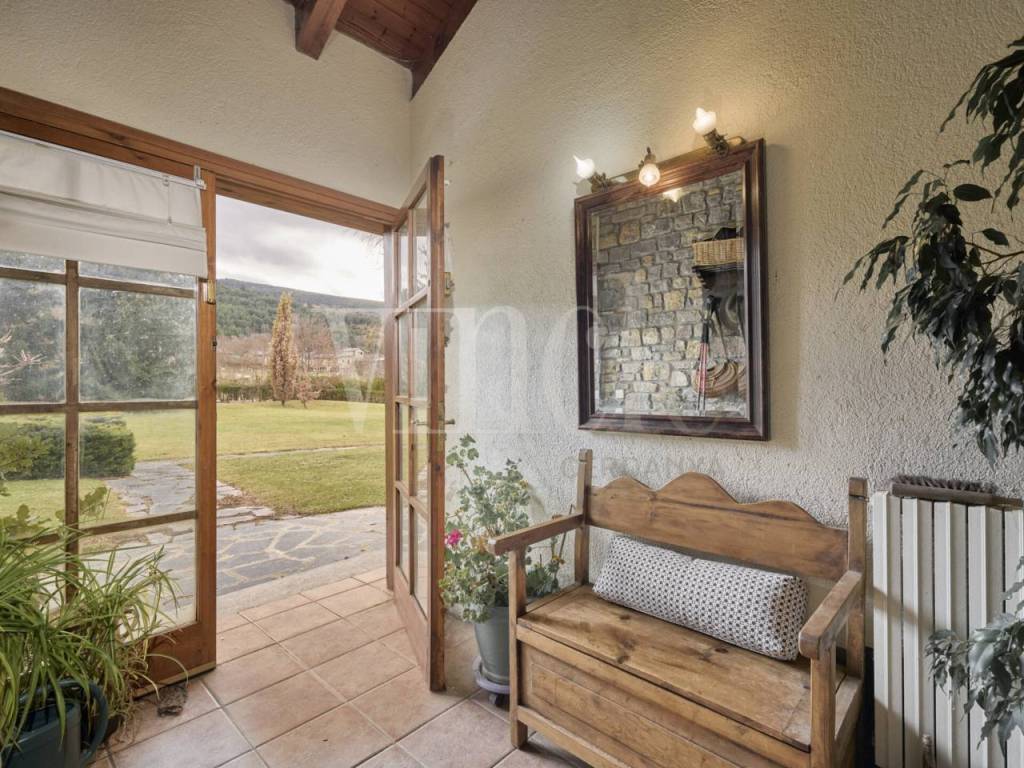 Мы заходим в дом через коридор, который ведет нас в дневную зону, где мы находим полностью оборудованную кухню с барной стойкой, обеденную зону и очень уютную гостиную с двусторонним камином, который придает тепло как гостиной, так и обеденной зоне. Из этого пространства мы выходим на просторную и приятную веранду, а также в ухоженный общий сад. На этом уровне также есть ванная комната.