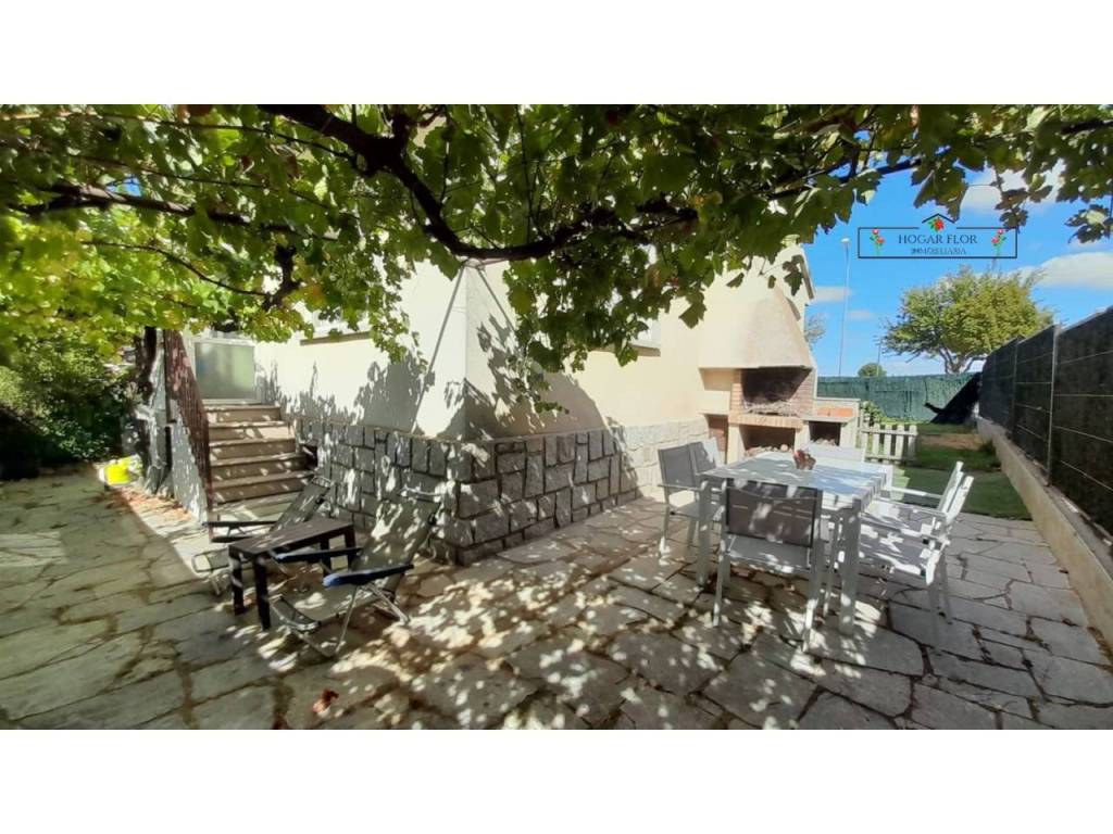 Tenemos en el perímetro exterior, que abarca el lateral izquierdo y la trasera de la casa, una barbacoa y zona de relax, con suelo de cemento, y con sombra de árboles y a la que se accede también por la salida de detrás de la casa, desde la cocina.
