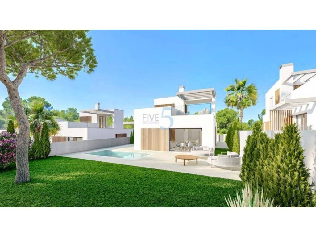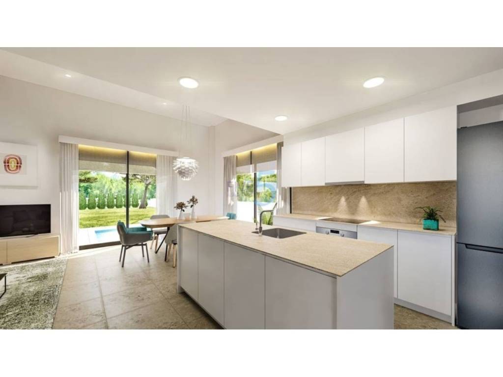 Los exteriores de estas viviendas destacan por su diseño moderno y funcional. Cada chalet cuenta con un jardín privado, perfecto para disfrutar del clima mediterráneo. Las terrazas amplias ofrecen un espacio ideal para relajarse o entretener a los invitados, mientras que la pérgola proporciona sombra y estilo. Además, cada propiedad incluye una piscina privada, permitiendo disfrutar de un refrescante baño en la comodidad de su hogar. El acceso a un garaje privado asegura comodidad y seguridad para los residentes.