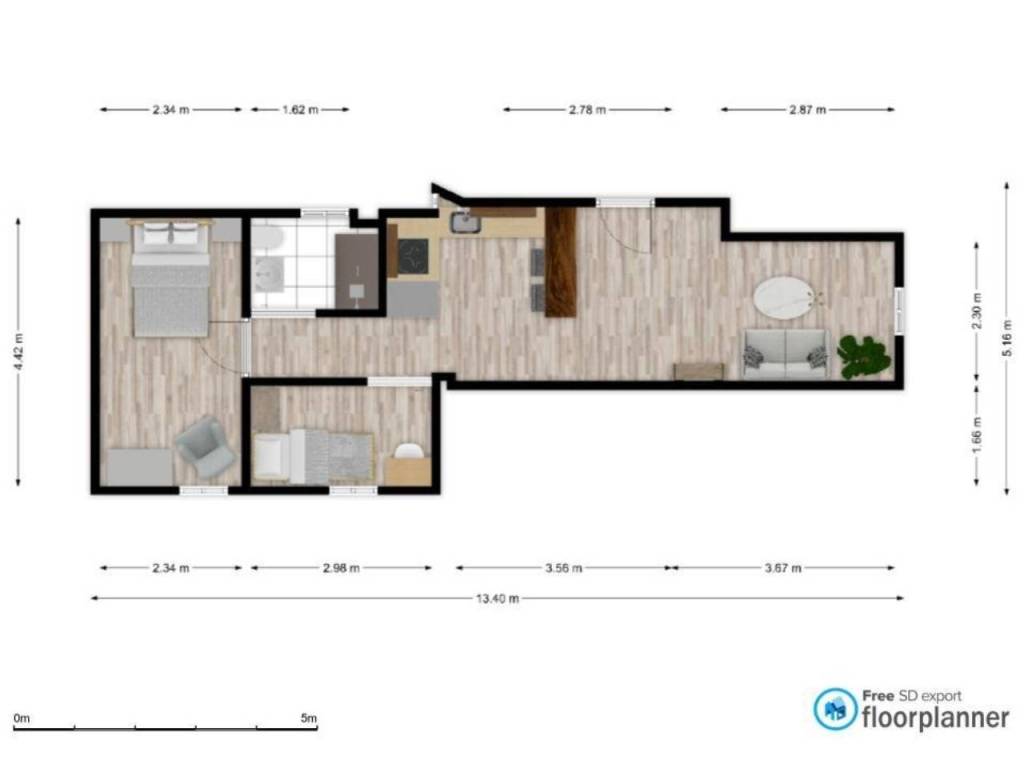 Con unos 55 m² de superficie construida, su distribución ha sido optimizada para ganar en amplitud y consta de: un amplio espacio de unos 24 m2 de salón/comedor, abierto a una moderna cocina americana totalmente amueblada y equipada. La estancia fue reforzada estructuralmente con una viga de acero en "H".